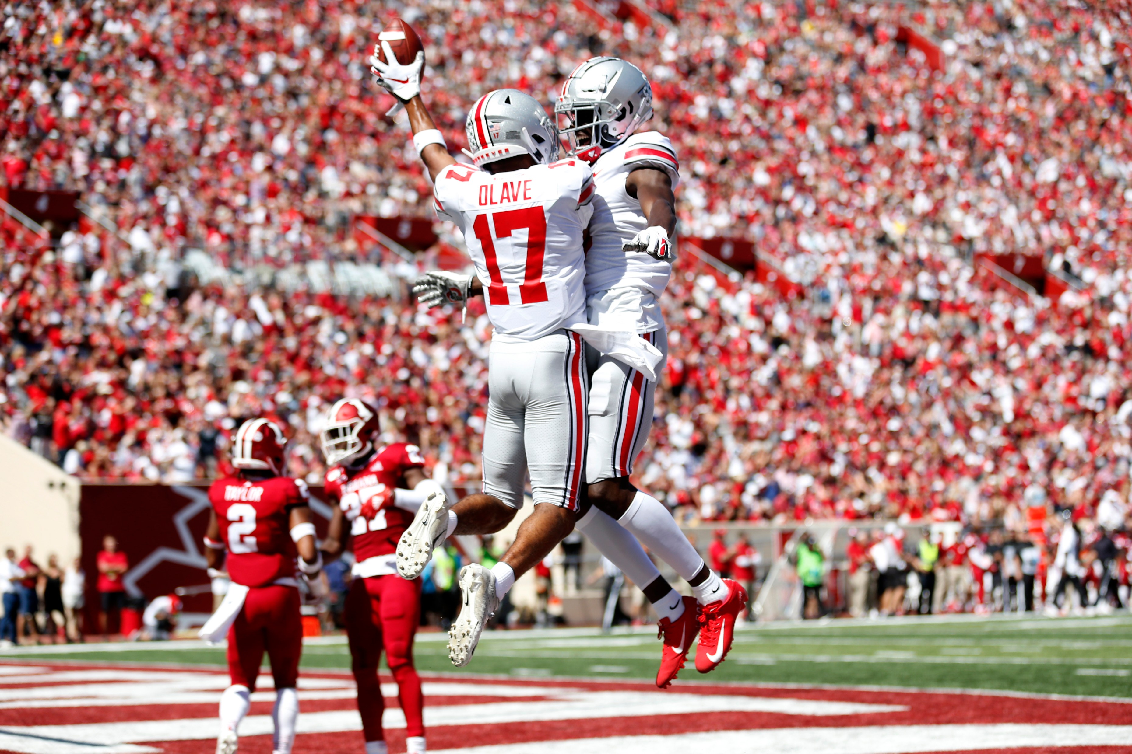 BLOOMINGTON, INDIANA – SEPTEMBER 14: Chris Olave #17 and Binjimen Victor #9 of the Ohio State Buckeyes celebrate after a safety in the game against the Indiana Hoosiers at Memorial Stadium on September 14, 2019 in Bloomington, Indiana. (Photo by Justin Casterline/Getty Images)