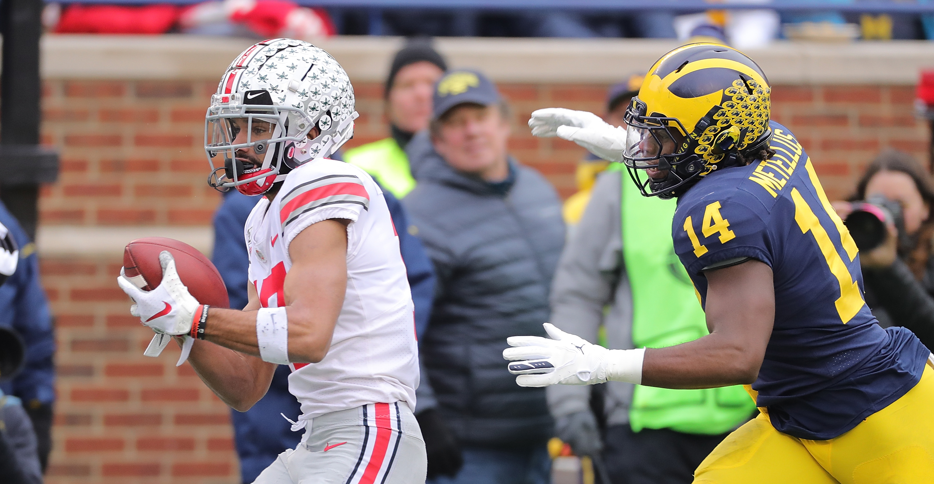 ANN ARBOR, MI – NOVEMBER 30: Chris Olave #17 of the Ohio State Buckeyes scores a first quarter touchdown as Josh Metellus #14 of the Michigan Wolverines gives chase during the game against the Michigan Wolverines at Michigan Stadium on November 30, 2019 in Ann Arbor, Michigan. (Photo by Leon Halip/Getty Images)