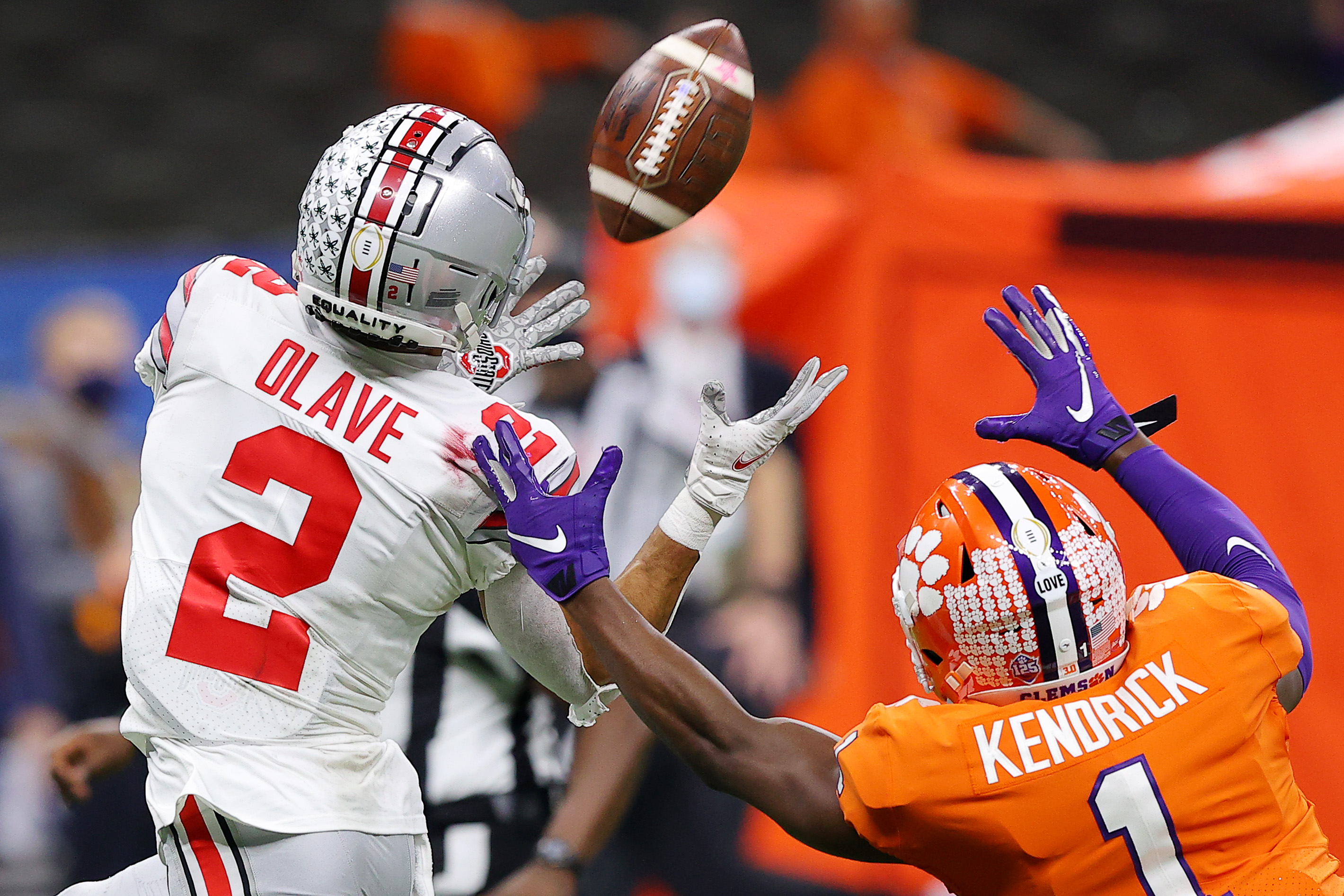 NEW ORLEANS, LOUISIANA – JANUARY 01: Chris Olave #2 of the Ohio State Buckeyes catches a touchdown pass against Derion Kendrick #1 of the Clemson Tigers in the third quarter during the College Football Playoff semifinal game at the Allstate Sugar Bowl at Mercedes-Benz Superdome on January 01, 2021 in New Orleans, Louisiana. (Photo by Kevin C. Cox/Getty Images)
