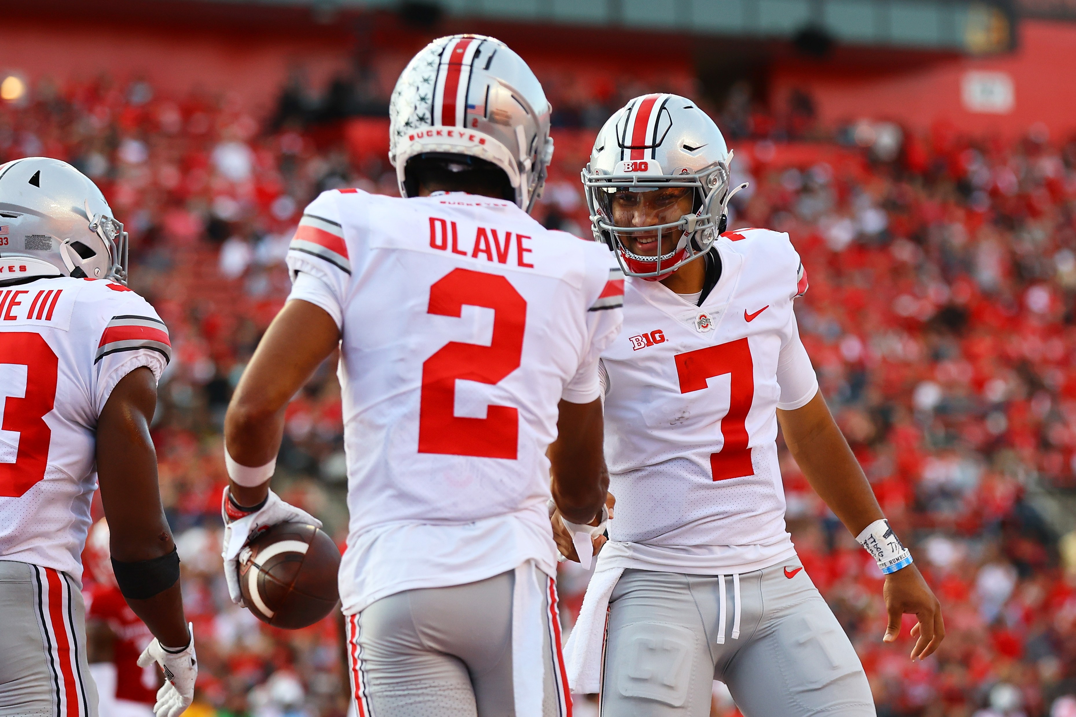 PISCATAWAY, NEW JERSEY – OCTOBER 02: Chris Olave #2 of the Ohio State Buckeyes celebrates scoring a touchdown with C.J. Stroud #7 against the Rutgers Scarlet Knights at SHI Stadium on October 02, 2021 in Piscataway, New Jersey. (Photo by Mike Stobe/Getty Images)