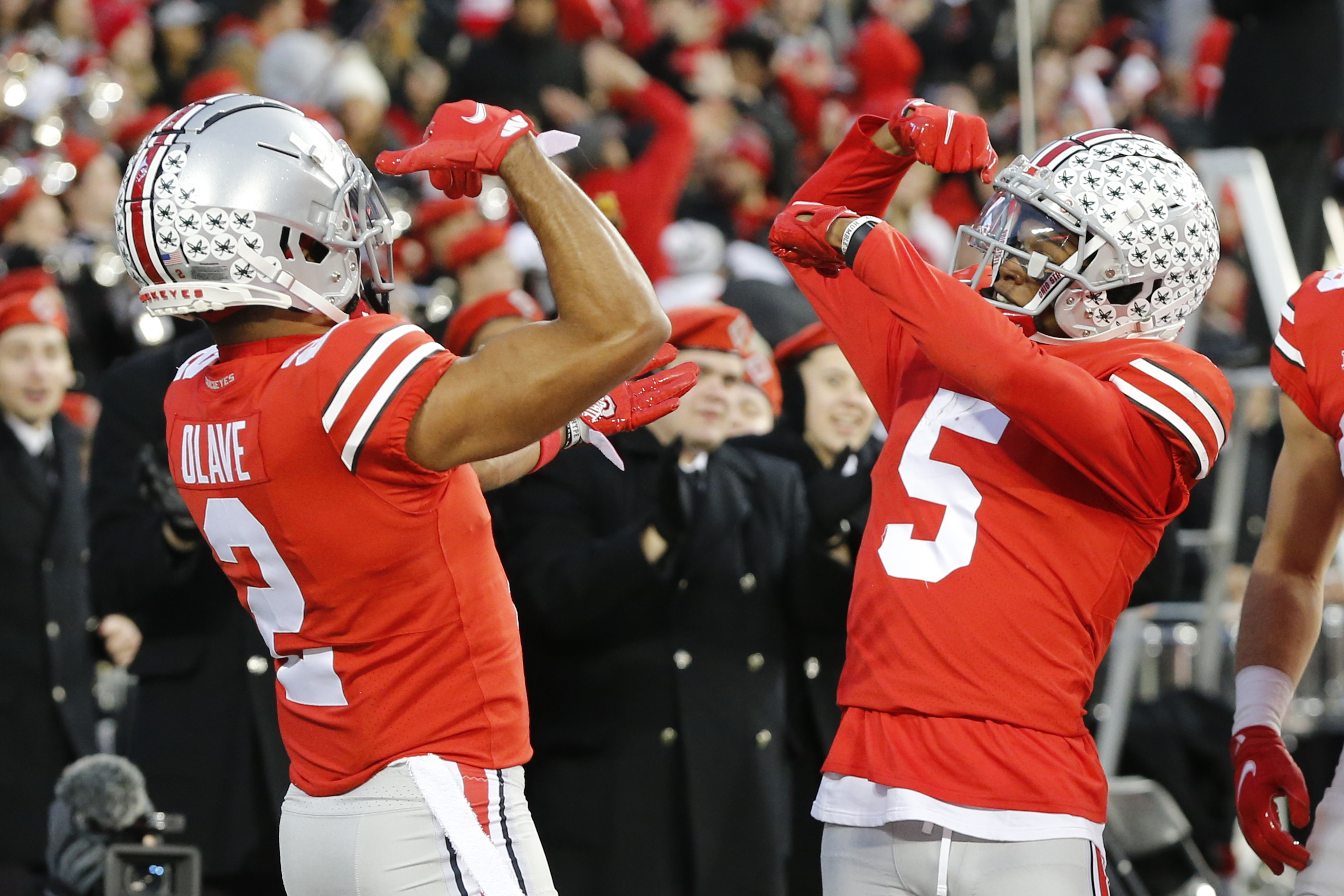 ANN ARBOR, MICHIGAN – NOVEMBER 30: Chris Olave #17 of the Ohio State Buckeyes celebrates his first half touchdown Garrett Wilson #5 while playin the Michigan Wolverines at Michigan Stadium on November 30, 2019 in Ann Arbor, Michigan. (Photo by Gregory Shamus/Getty Images)