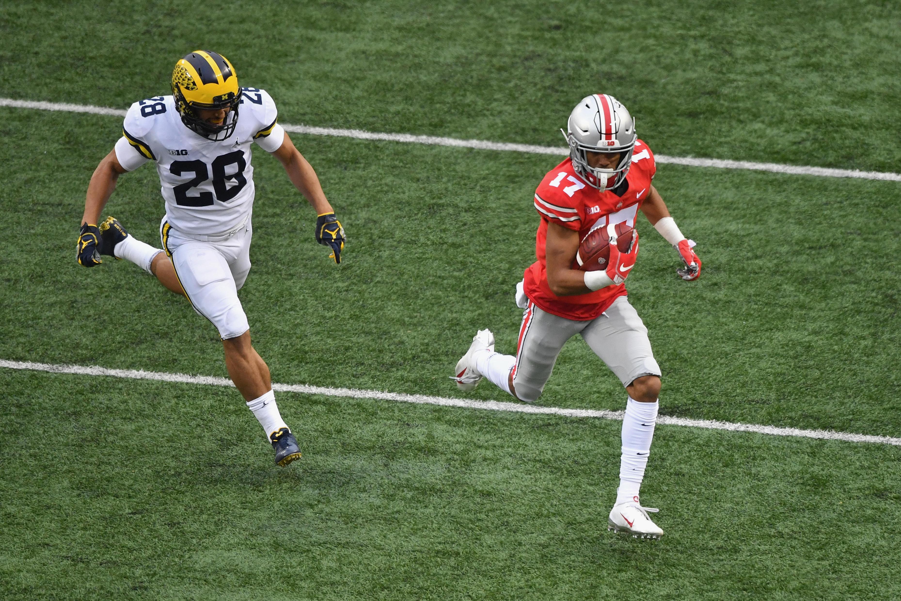 COLUMBUS, OH – NOVEMBER 24: Chris Olave #17 of the Ohio State Buckeyes outruns Brandon Watson #28 of the Michigan Wolverines for a 24-yard touchdown catch in the first quarter at Ohio Stadium on November 24, 2018 in Columbus, Ohio. (Photo by Jamie Sabau/Getty Images)