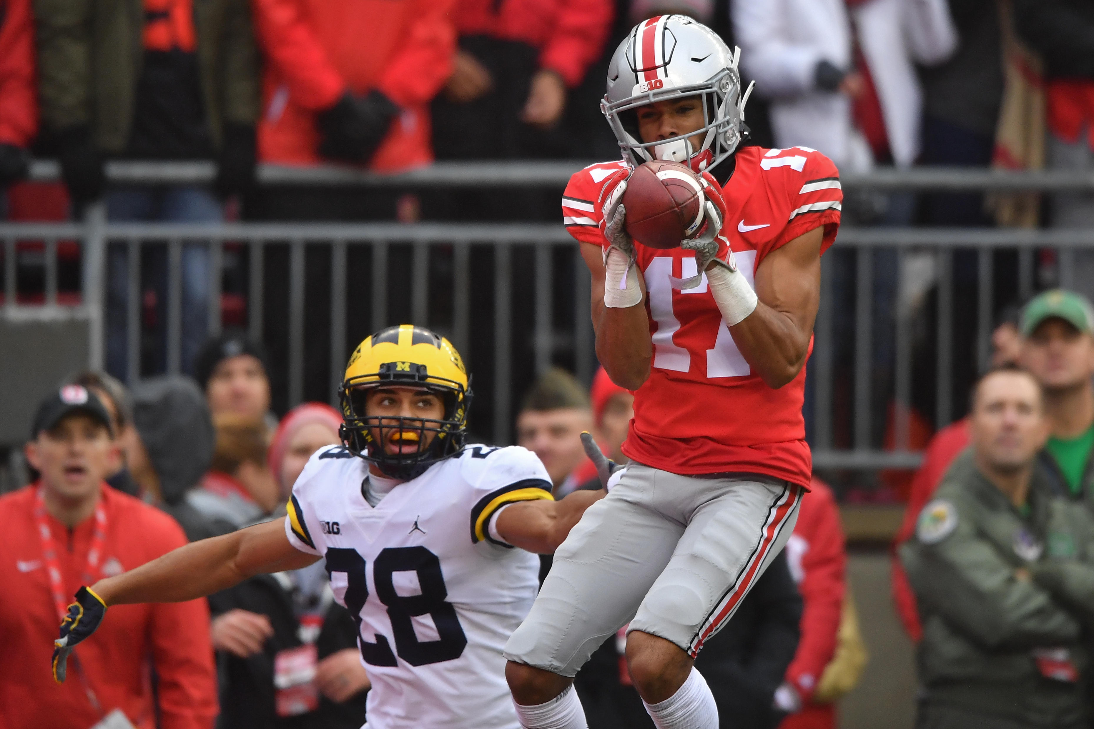 COLUMBUS, OH – NOVEMBER 24: Chris Olave #17 of the Ohio State Buckeyes catches a 24-yard touchdown pass in the second quarter in front of Brandon Watson #28 of the Michigan Wolverines at Ohio Stadium on November 24, 2018 in Columbus, Ohio. (Photo by Jamie Sabau/Getty Images)