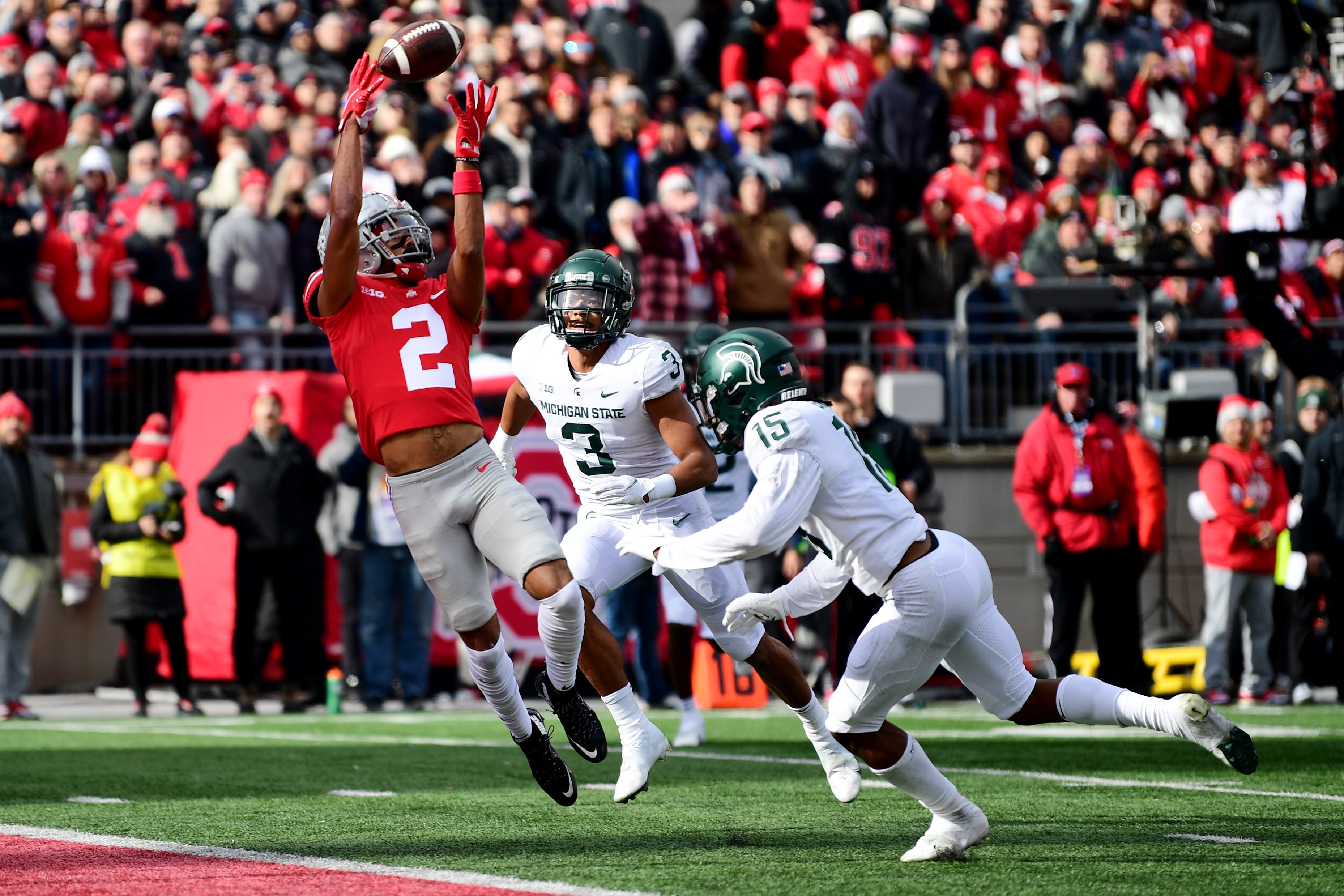 COLUMBUS, OHIO – NOVEMBER 20: Chris Olave #2 of the Ohio State Buckeyes catches a pass for a touchdown during the first half of a game against the Michigan State Spartans at Ohio Stadium on November 20, 2021 in Columbus, Ohio. (Photo by Emilee Chinn/Getty Images)