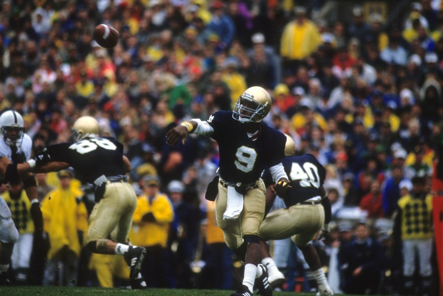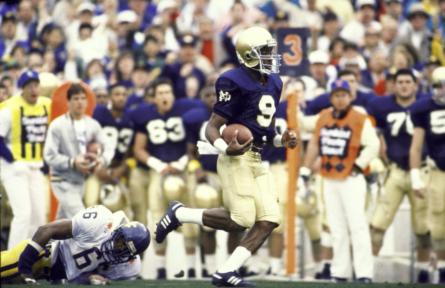 What the 1988 Fighting Irish did in the regular season rivals any in college football history. It began with a 19-17 win over No. 9 Michigan to firmly put Notre Dame in the top 10. The team was 5-0 before meeting No. 1 Miami in the “Catholics vs. Convicts” game. The Irish won 31-30 to snap Miami’s 36-game regular-season winning streak.