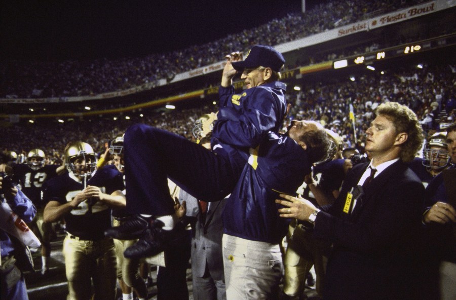 Times were simpler in 1988 as Notre Dame needed one Fiesta Bowl win over No. 3 West Virginia to be the consensus champion. They beat the Mountaineers 34-21 to end the season with wins over teams ranked No. 1, No. 2, and No. 3 for the program’s 11th national championship.
