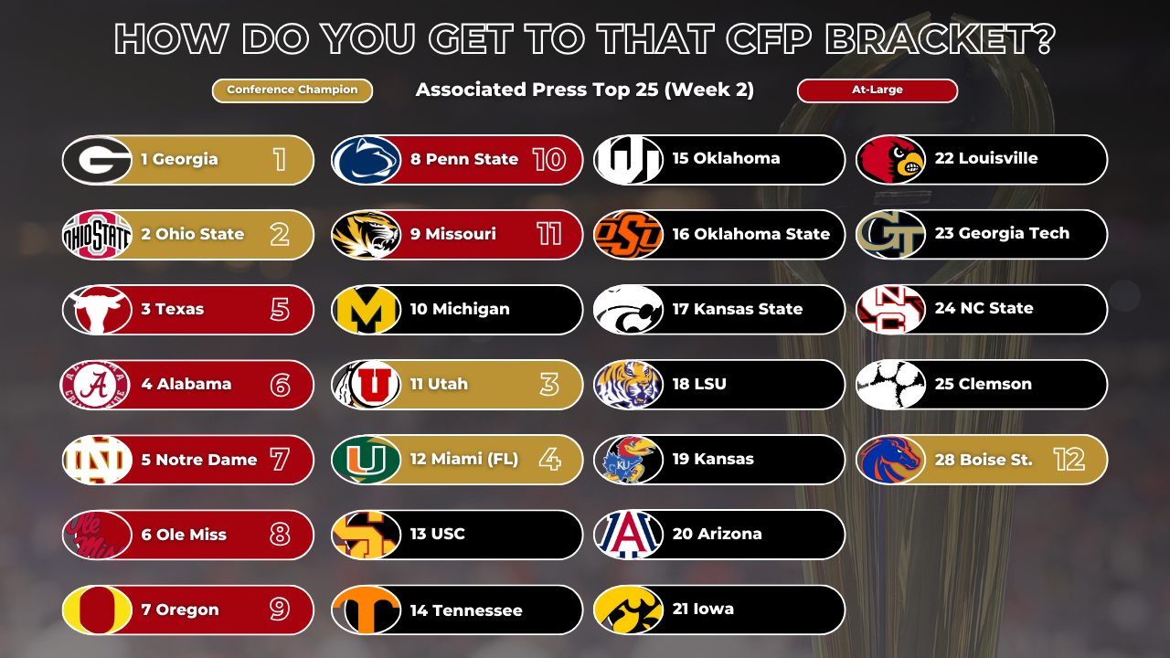 Here is how the playoff bracket looks heading into Week 2 based on Associated Press rankings and what changes we could see after Saturday. Although the AP poll won’t be used in seeding teams, the official rankings won’t start coming out until November, so we can use it until then to get a sense of where teams lie.