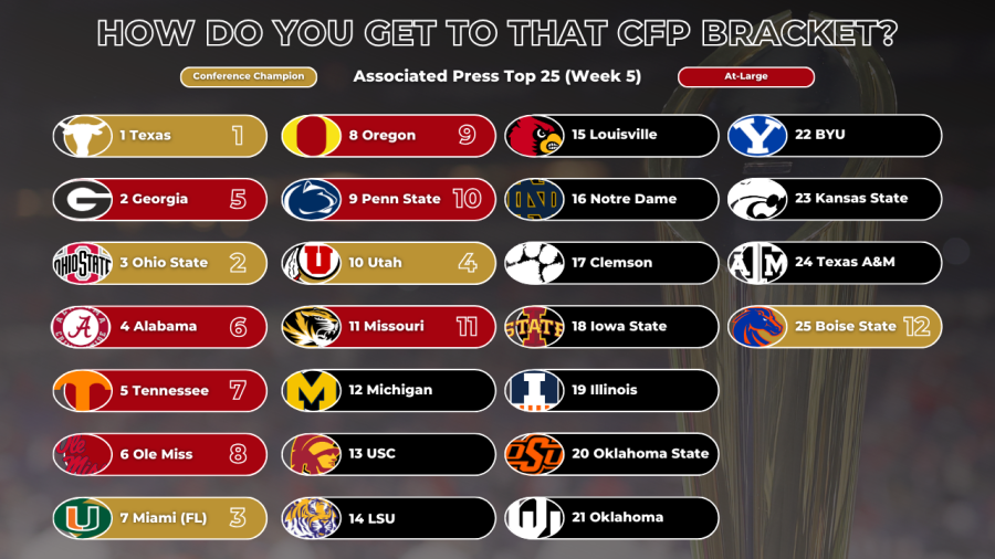 NBC4 is providing a look at a projected 12-team playoff bracket every week this season before the first rankings are revealed on Nov. 5. Here is how the playoff bracket looks heading into Week 5 based on the Associated Press rankings and what changes we could see after Saturday’s action.