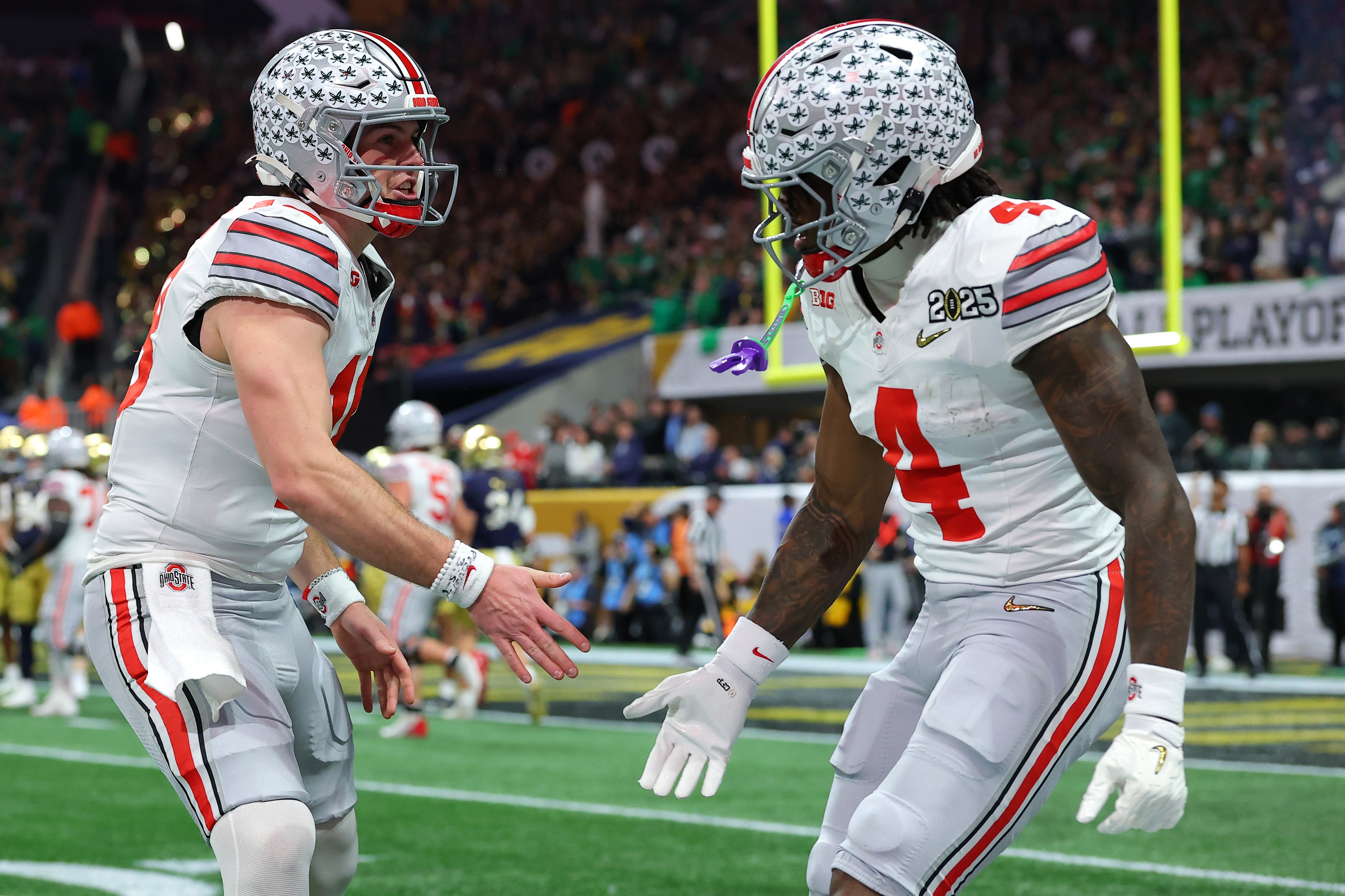 ATLANTA, GEORGIA – JANUARY 20: Jeremiah Smith #4 celebrates after scoring touchdown against the Notre Dame Fighting Irish with Will Howard #18 of the Ohio State Buckeyes during the second quarter in the 2025 CFP National Championship at the Mercedes-Benz Stadium on January 20, 2025 in Atlanta, Georgia. (Photo by Kevin C. Cox/Getty Images)