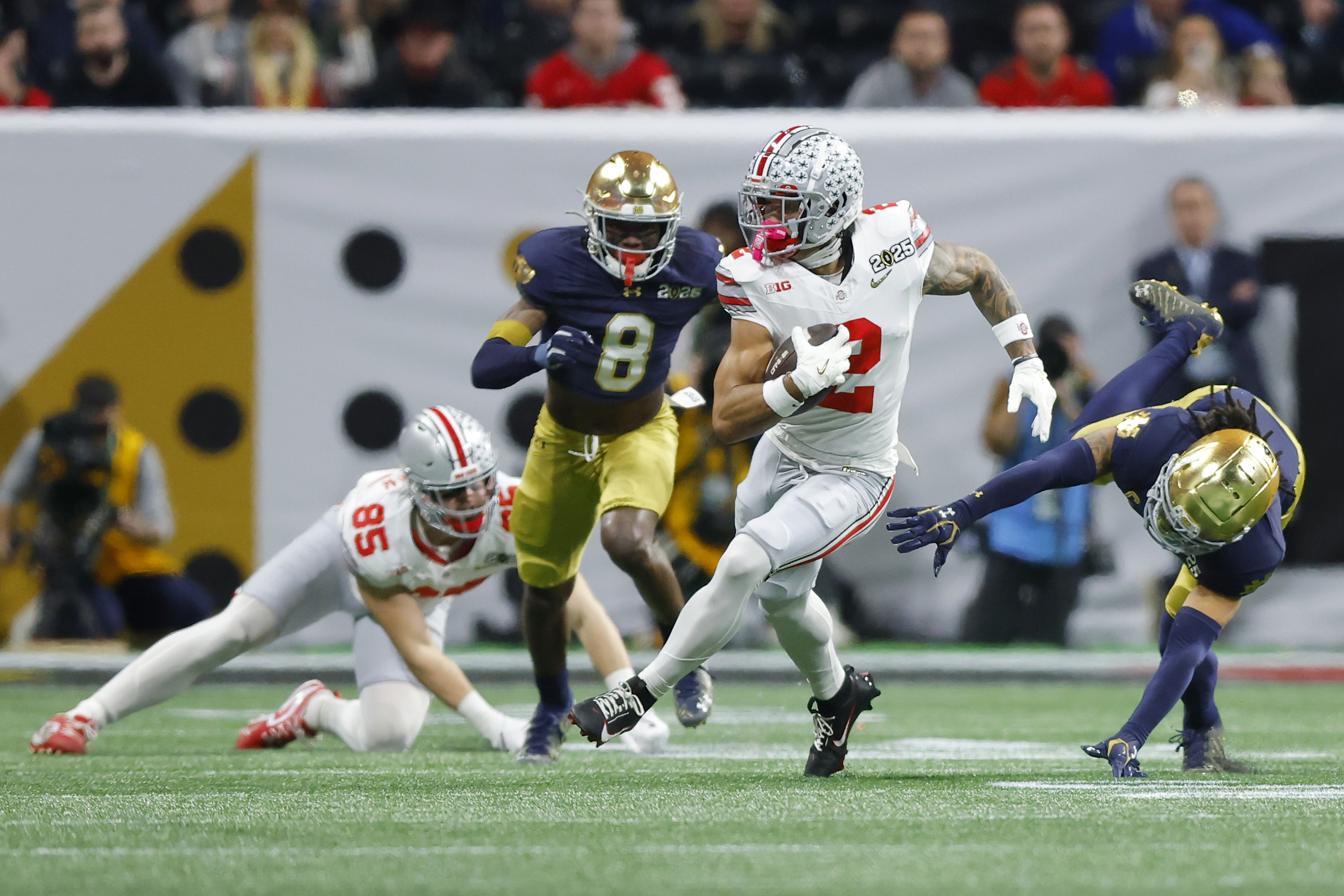 ATLANTA, GEORGIA – JANUARY 20: Emeka Egbuka #2 of the Ohio State Buckeyes runs with the ball as Xavier Watts #0 of the Notre Dame Fighting Irish defends during the second quarter in the 2025 CFP National Championship at the Mercedes-Benz Stadium on January 20, 2025 in Atlanta, Georgia. (Photo by Alex Slitz/Getty Images)