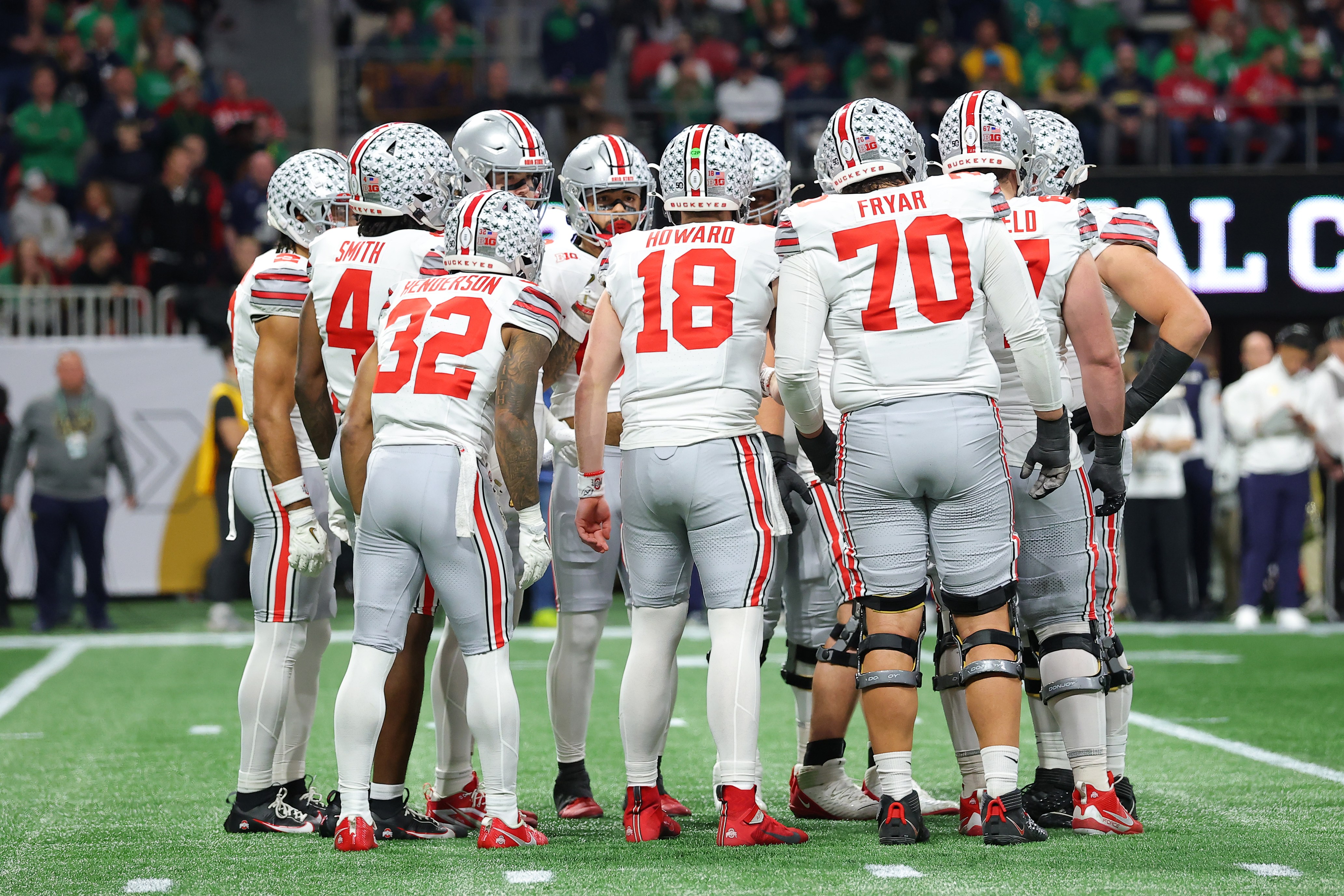 ATLANTA, GEORGIA – JANUARY 20: Will Howard #18 of the Ohio State Buckeyes huddles with the team during the second quarter against the Notre Dame Fighting Irish in the 2025 CFP National Championship at the Mercedes-Benz Stadium on January 20, 2025 in Atlanta, Georgia. (Photo by Kevin C. Cox/Getty Images)