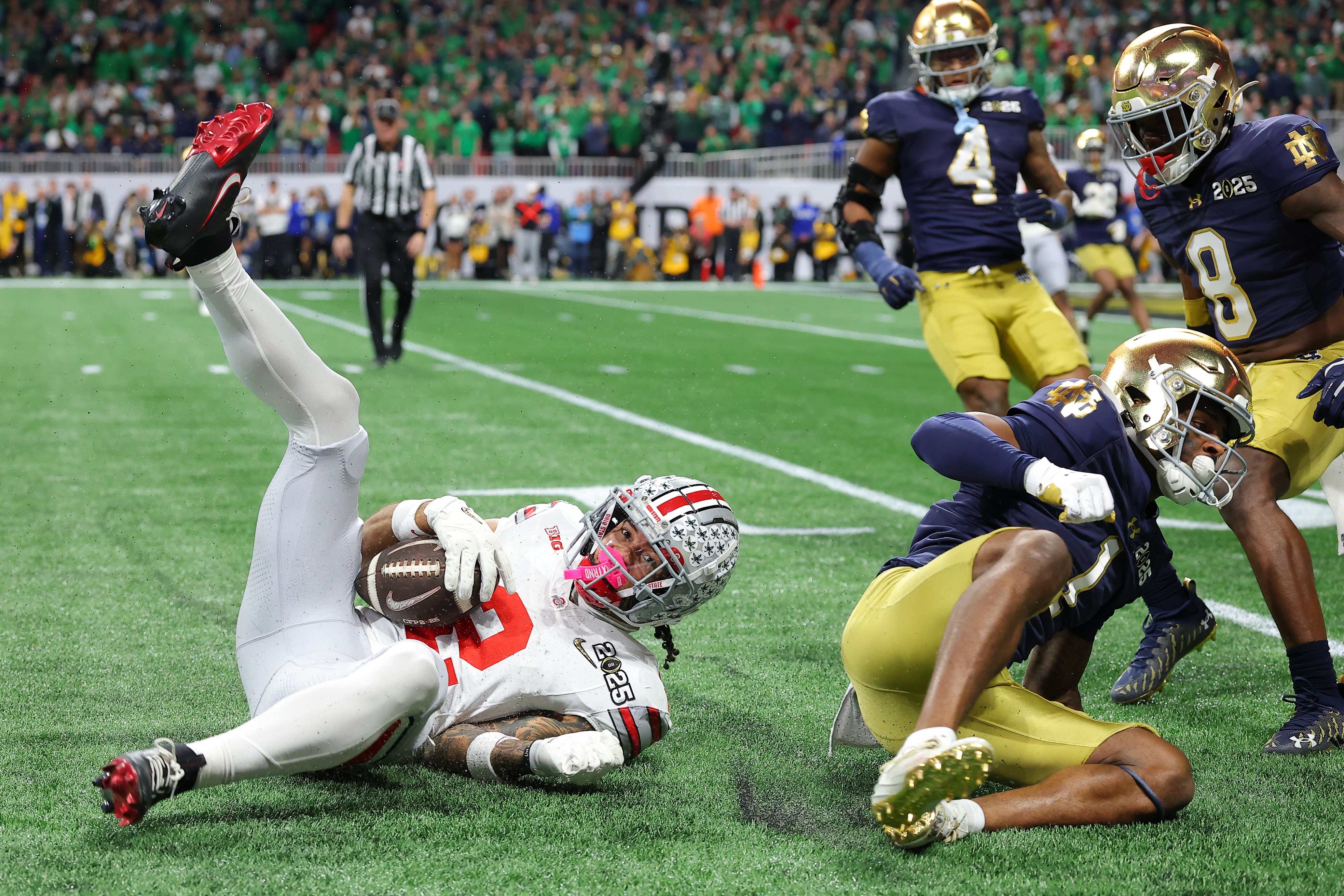 ATLANTA, GEORGIA - JANUARY 20: Emeka Egbuka #2 of the Ohio State Buckeyes is tackled by Jordan Clark #1 of the Notre Dame Fighting Irish during the second quarter in the 2025 CFP National Championship at the Mercedes-Benz Stadium on January 20, 2025 in Atlanta, Georgia. (Photo by Todd Kirkland/Getty Images)