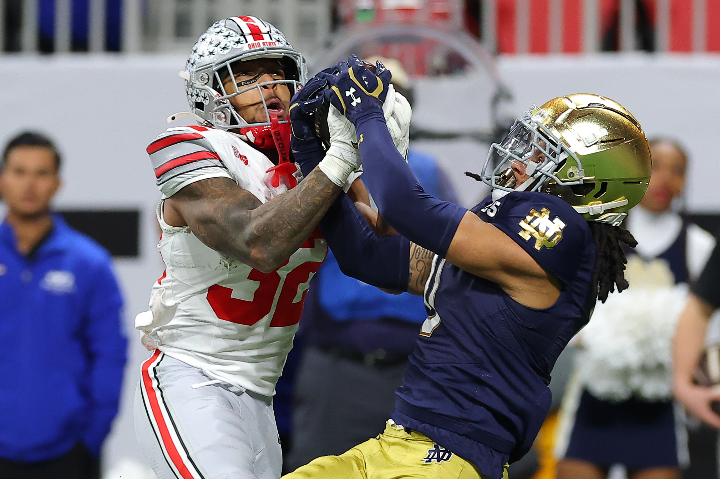 ATLANTA, GEORGIA – JANUARY 20: Xavier Watts #0 of the Notre Dame Fighting Irish breaks up a pass intended for TreVeyon Henderson #32 of the Ohio State Buckeyes during the second quarter in the 2025 CFP National Championship at the Mercedes-Benz Stadium on January 20, 2025 in Atlanta, Georgia. (Photo by Kevin C. Cox/Getty Images)