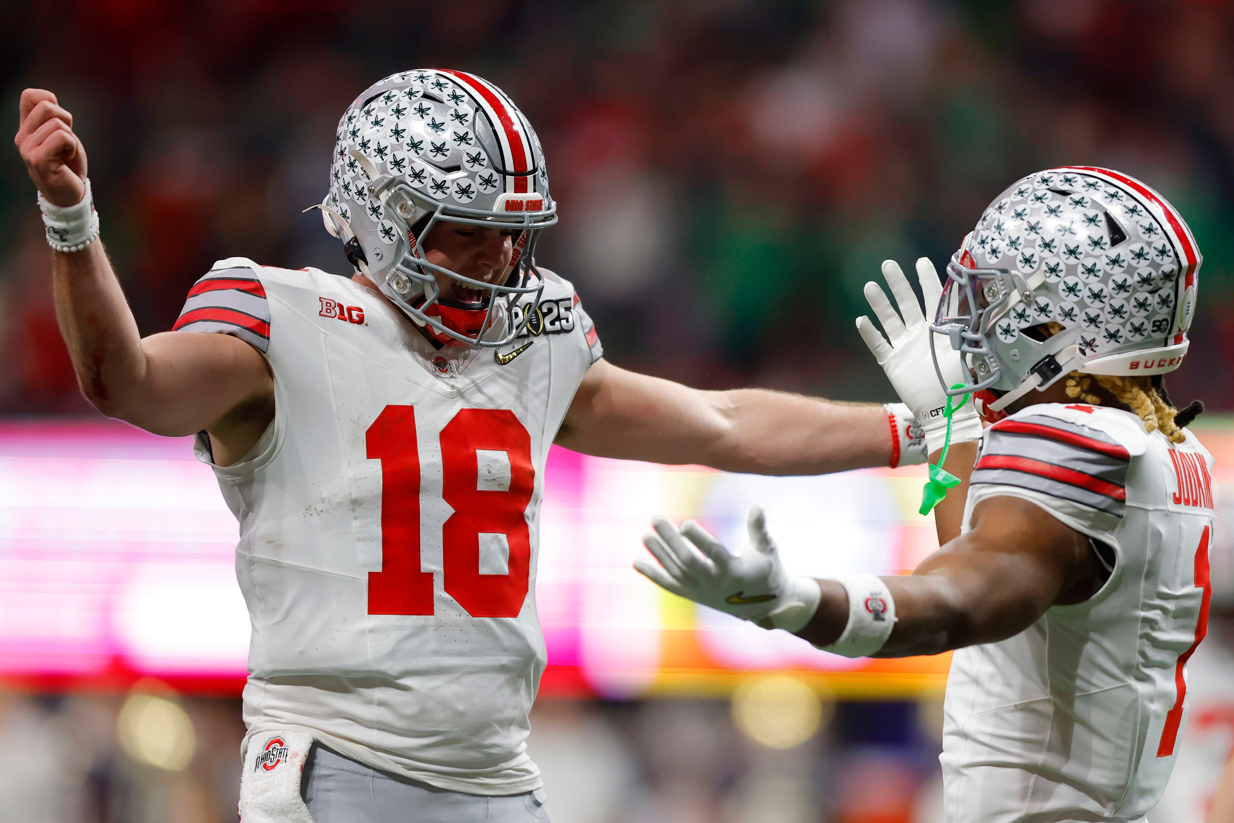 ATLANTA, GEORGIA – JANUARY 20: Will Howard #18 and Quinshon Judkins #1 of the Ohio State Buckeyes celebrate a touchdown from Judkins during the second quarter in the 2025 CFP National Championship at the Mercedes-Benz Stadium on January 20, 2025 in Atlanta, Georgia. (Photo by Todd Kirkland/Getty Images)