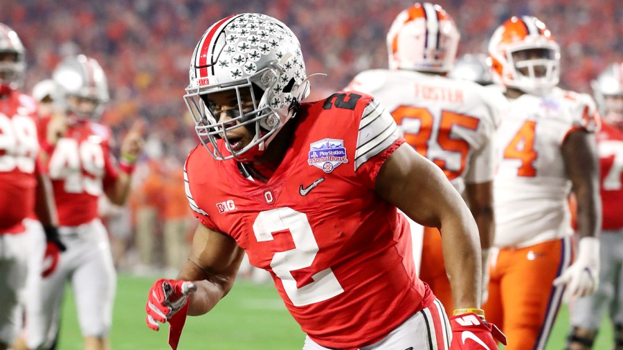 GLENDALE, ARIZONA - DECEMBER 28: J.K. Dobbins #2 of the Ohio State Buckeyes celebrates after her runs the ball for 68-yard a touchdown against the Clemson Tigers in the first half during the College Football Playoff Semifinal at the PlayStation Fiesta Bowl at State Farm Stadium on December 28, 2019 in Glendale, Arizona. (Photo by Christian Petersen/Getty Images)