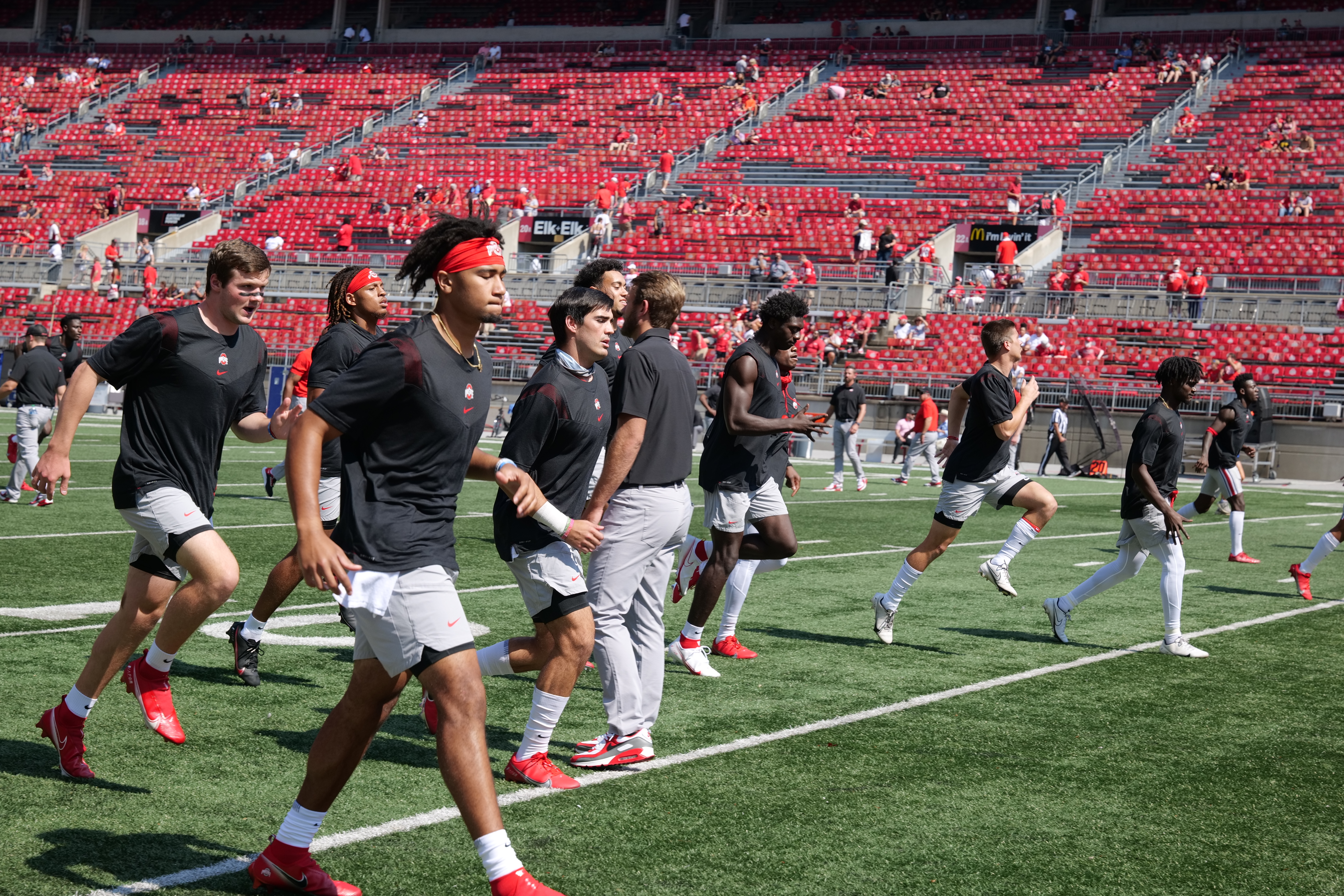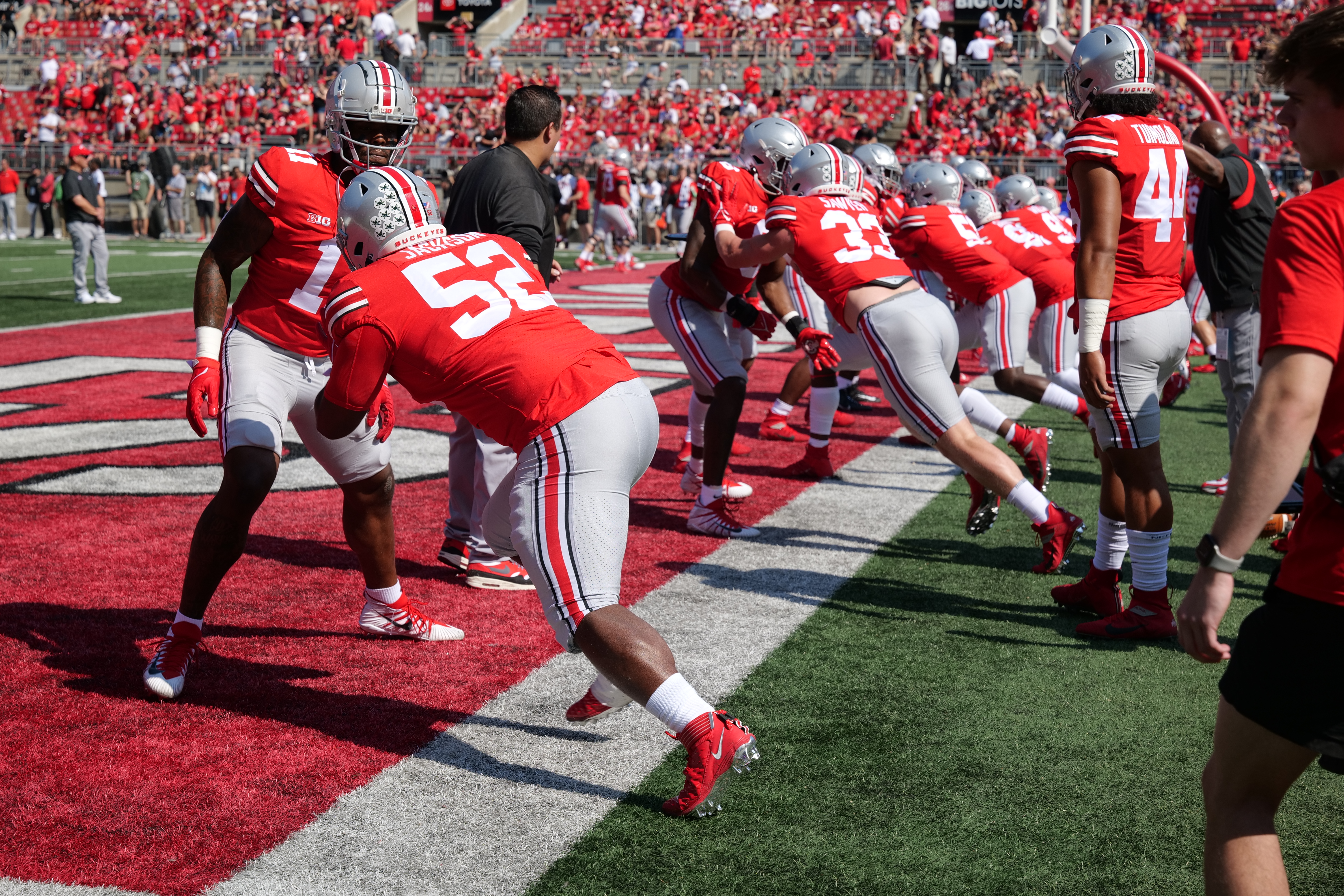The Buckeyes played without starting defensive end Zach Harrison and center Harry Miller and lost left guard Thayer Munford who left with a lower leg injury in the first quarter.