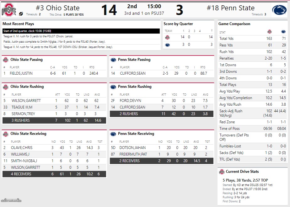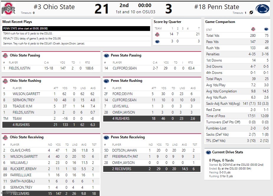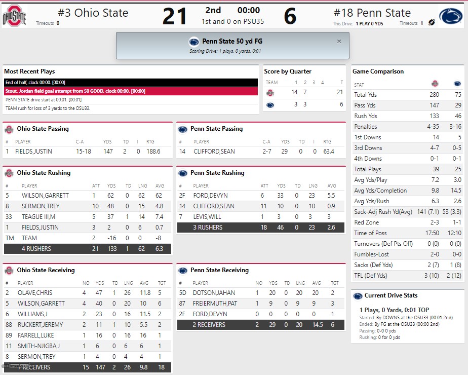 Just when it appeared halftime had arrived, it hadn’t. When Justin Fields kneeled on fourth down, he did so with a second on the clock. Penn State lined up for a 50-yard field-goal attempt, and was successful. Here are halftime stats updated after the field goal