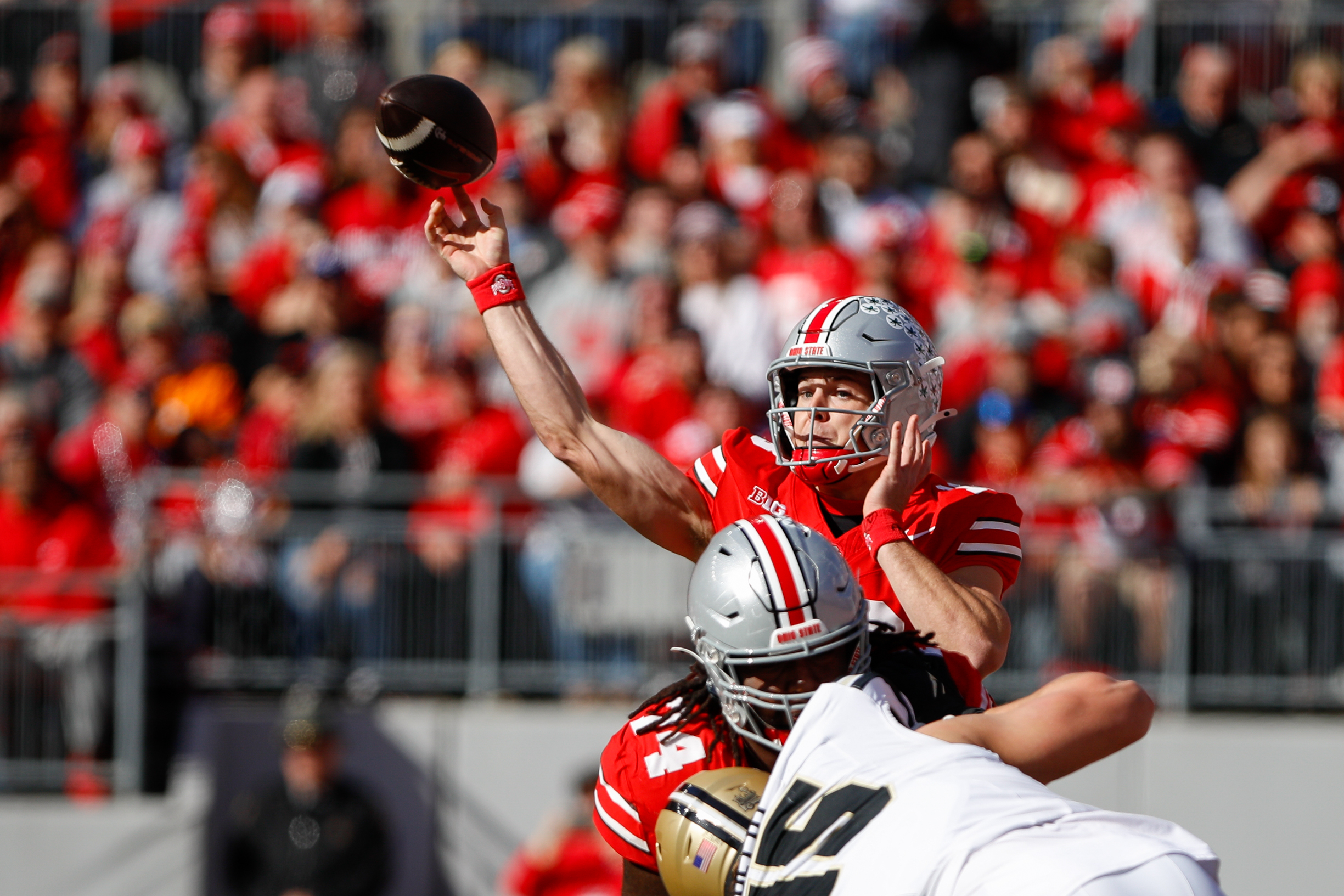 COLUMBUS, OH – NOVEMBER 09: Ohio State Buckeyes quarterback Will Howard (18) passes the ball during the game against the Purdue Boilermakers and the Ohio State Buckeyes on November 9, 2024, at Ohio Stadium in Columbus, OH. (Photo by Ian Johnson/Icon Sportswire via Getty Images)