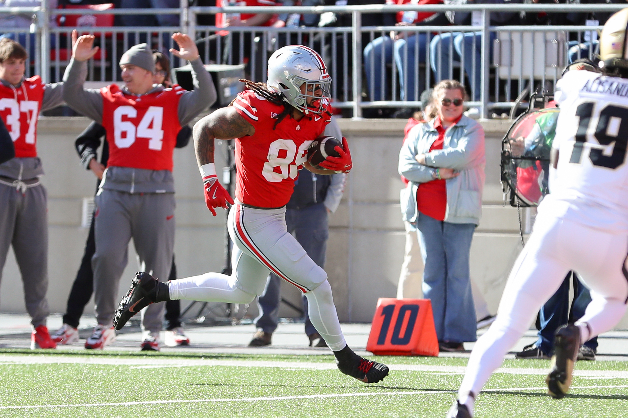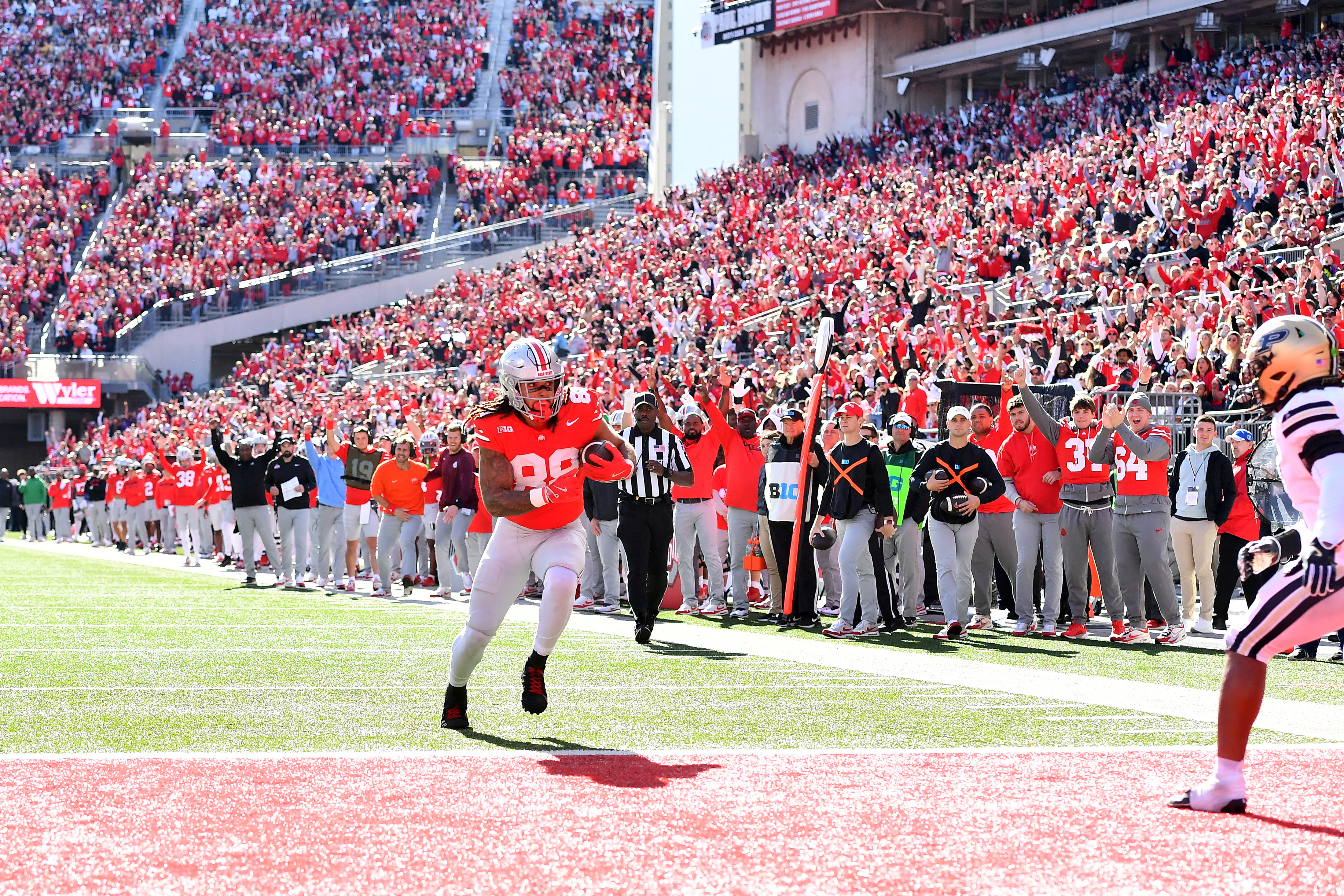 COLUMBUS, OH – NOVEMBER 09: Ohio State Buckeyes tight end Gee Scott Jr. (88) carries the ball for a touchdown during the game against the Purdue Boilermakers and the Ohio State Buckeyes on November 9, 2024, at Ohio Stadium in Columbus, OH. (Photo by Ian Johnson/Icon Sportswire via Getty Images)