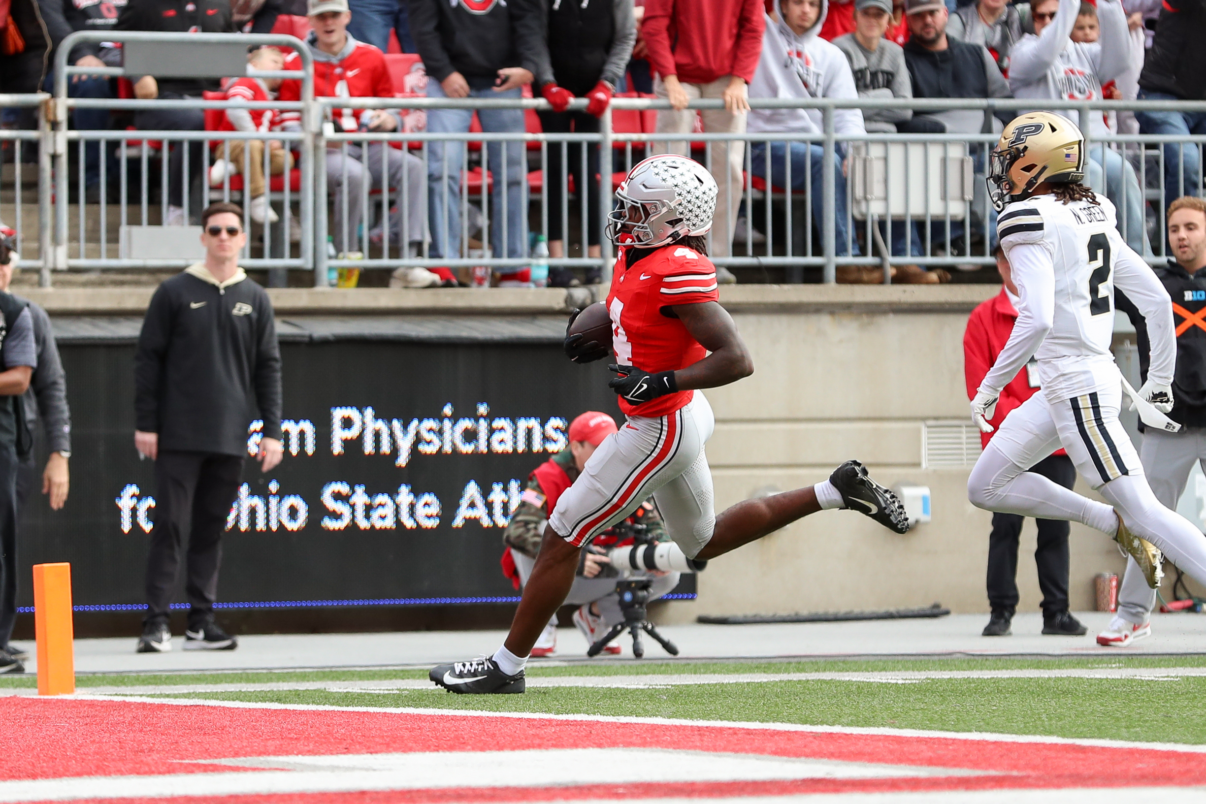 COLUMBUS, OH – NOVEMBER 09: Ohio State Buckeyes wide receiver Jeremiah Smith (4) carries the ball for a touchdown during the game against the Purdue Boilermakers and the Ohio State Buckeyes on November 9, 2024, at Ohio Stadium in Columbus, OH. (Photo by Ian Johnson/Icon Sportswire via Getty Images)