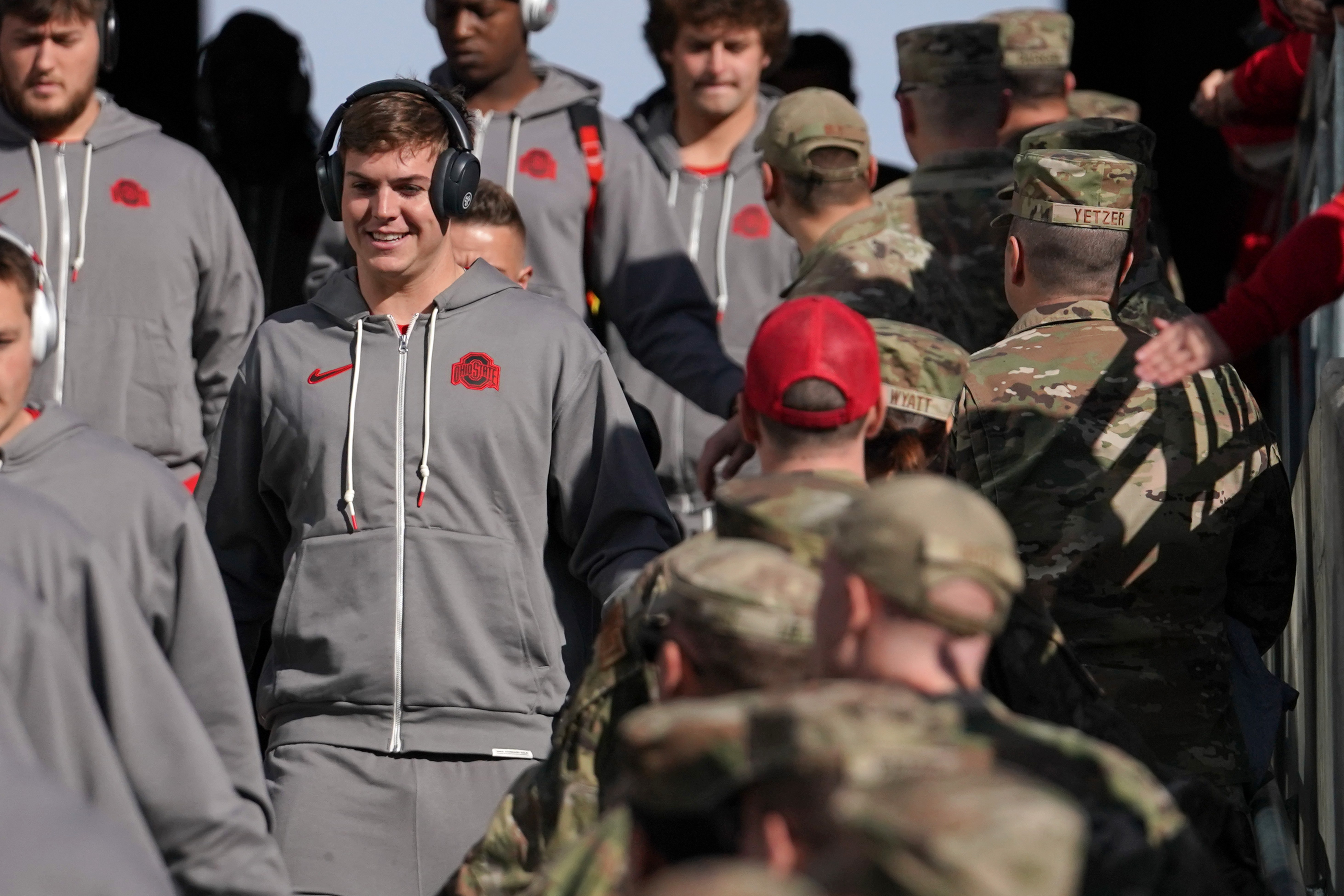 COLUMBUS, OHIO – NOVEMBER 09: Quarterback Will Howard #18 of the Ohio State Buckeyes greets members of the military as he walks in to Ohio Stadium before the game against the Purdue Boilermakers at Ohio Stadium on November 09, 2024 in Columbus, Ohio. (Photo by Jason Mowry/Getty Images)