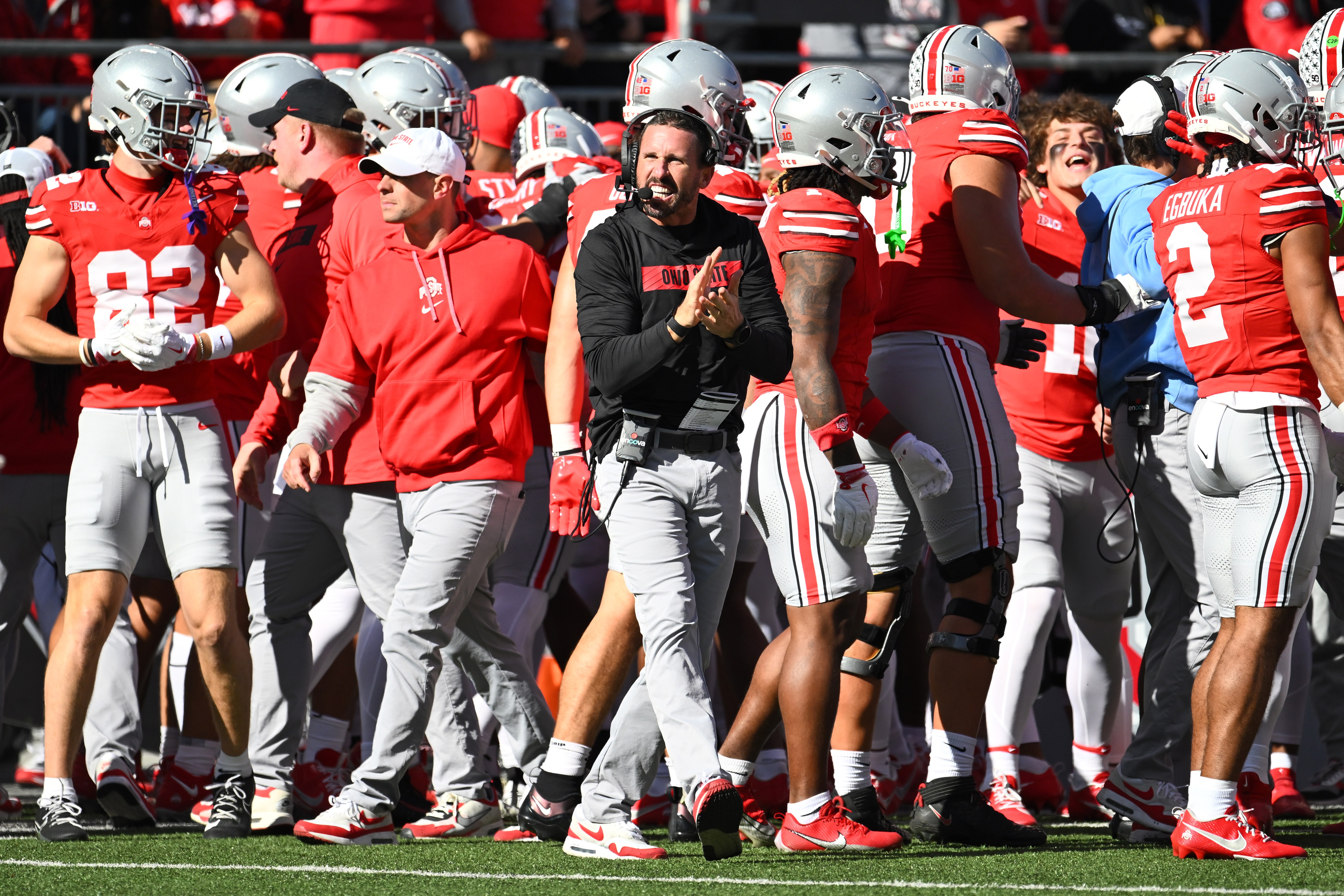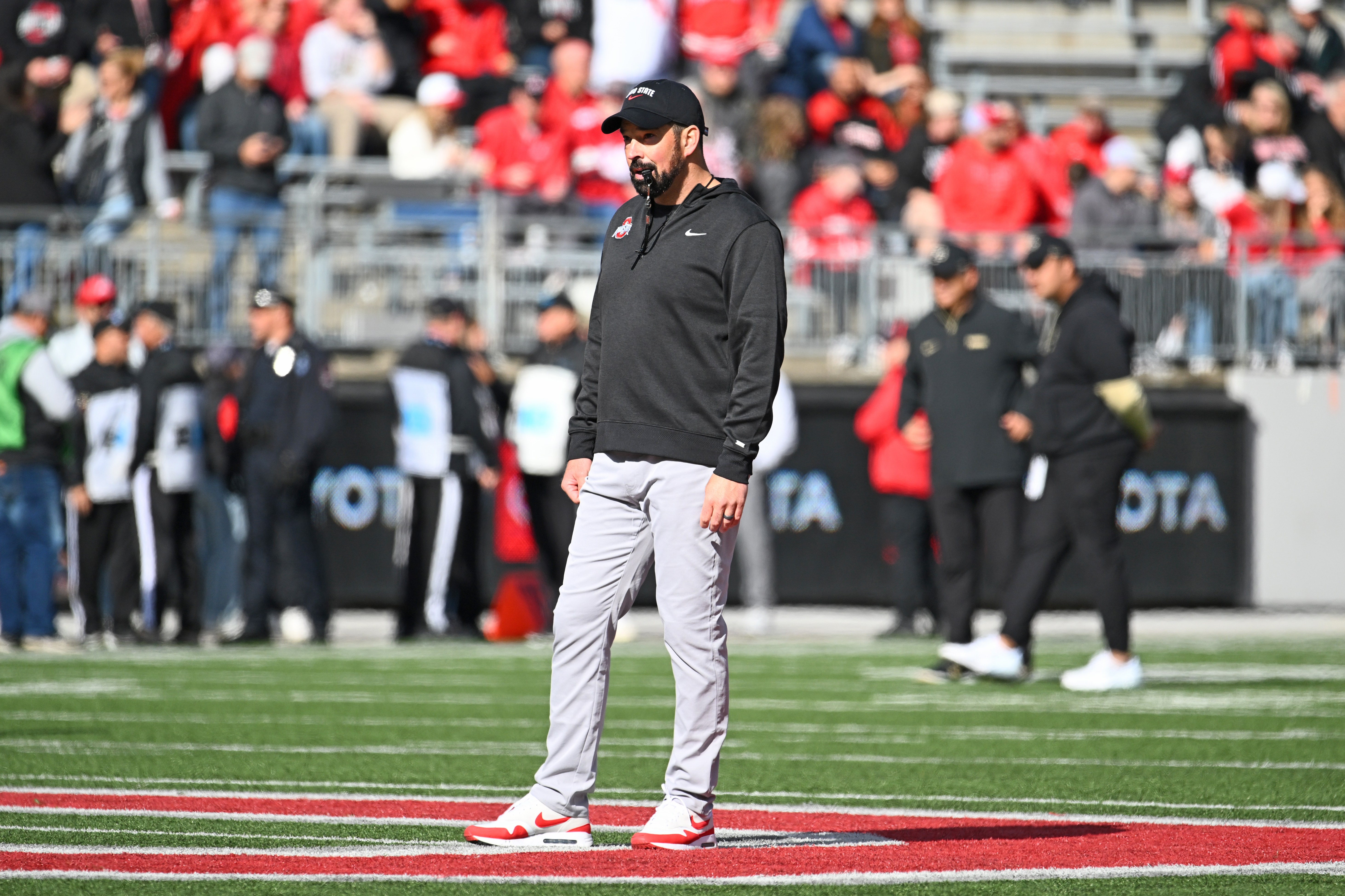COLUMBUS, OHIO – NOVEMBER 09: Head coach Ryan Day of the Ohio State Buckeyes watches warmups prior to a game against the Purdue Boilermakers at Ohio Stadium on November 09, 2024 in Columbus, Ohio. (Photo by Ben Jackson/Getty Images)