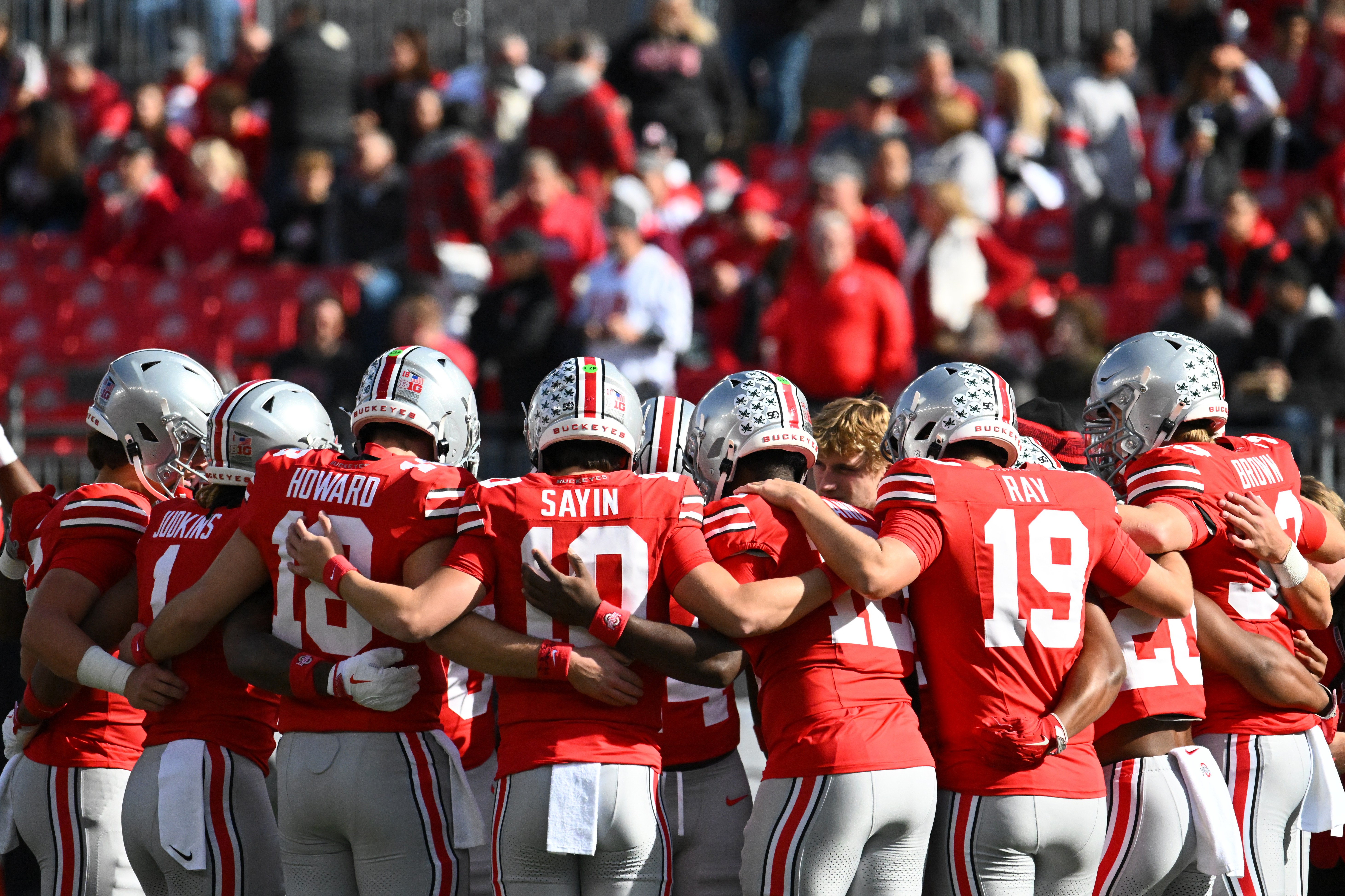 COLUMBUS, OHIO – NOVEMBER 09: The Ohio State Buckeyes huddle up prior to a game against the Purdue Boilermakers at Ohio Stadium on November 09, 2024 in Columbus, Ohio. (Photo by Ben Jackson/Getty Images)