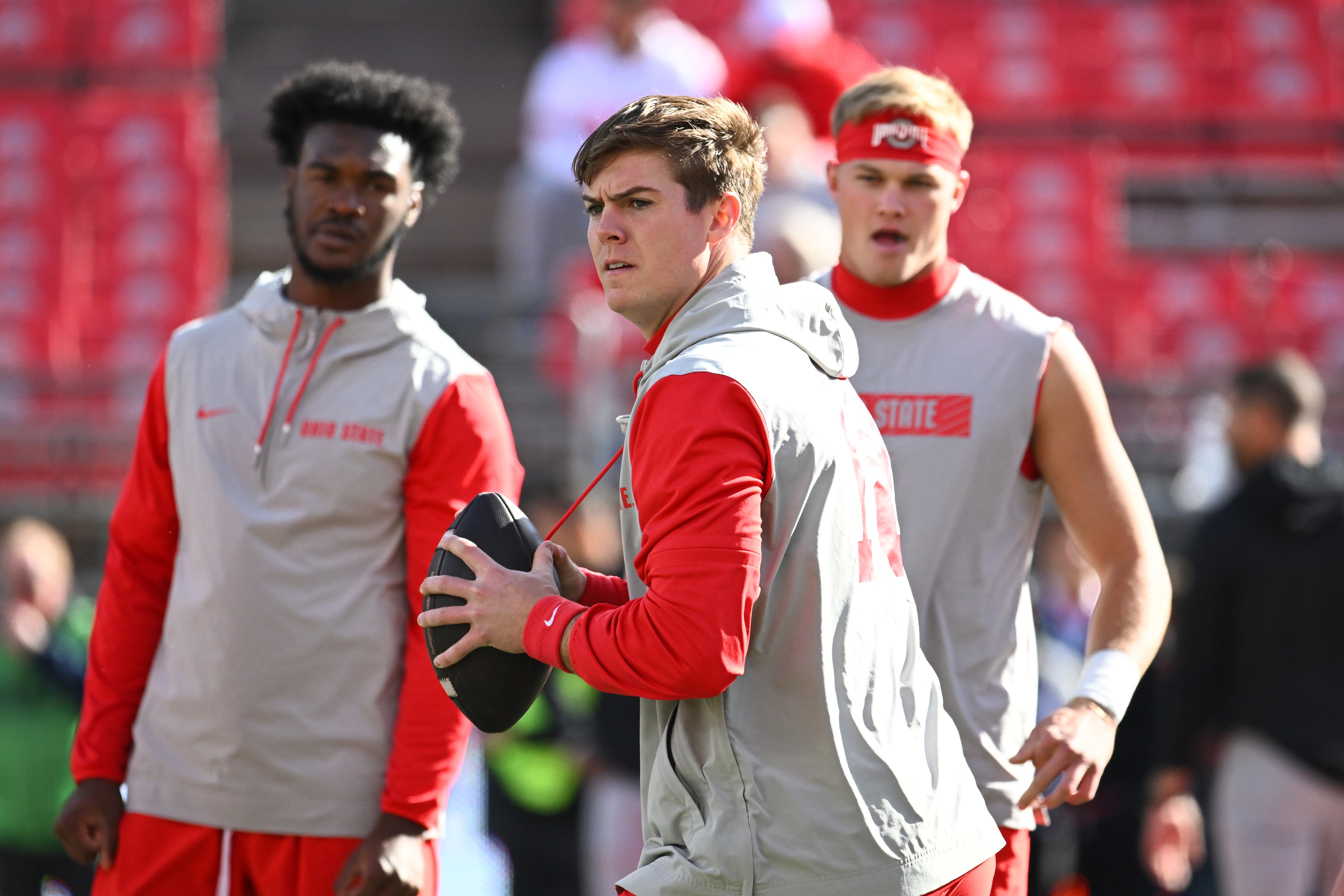 COLUMBUS, OHIO – NOVEMBER 09: Quarterback Will Howard #18 of the Ohio State Buckeyes warms up prior to a game against the Purdue Boilermakers at Ohio Stadium on November 09, 2024 in Columbus, Ohio. (Photo by Ben Jackson/Getty Images)