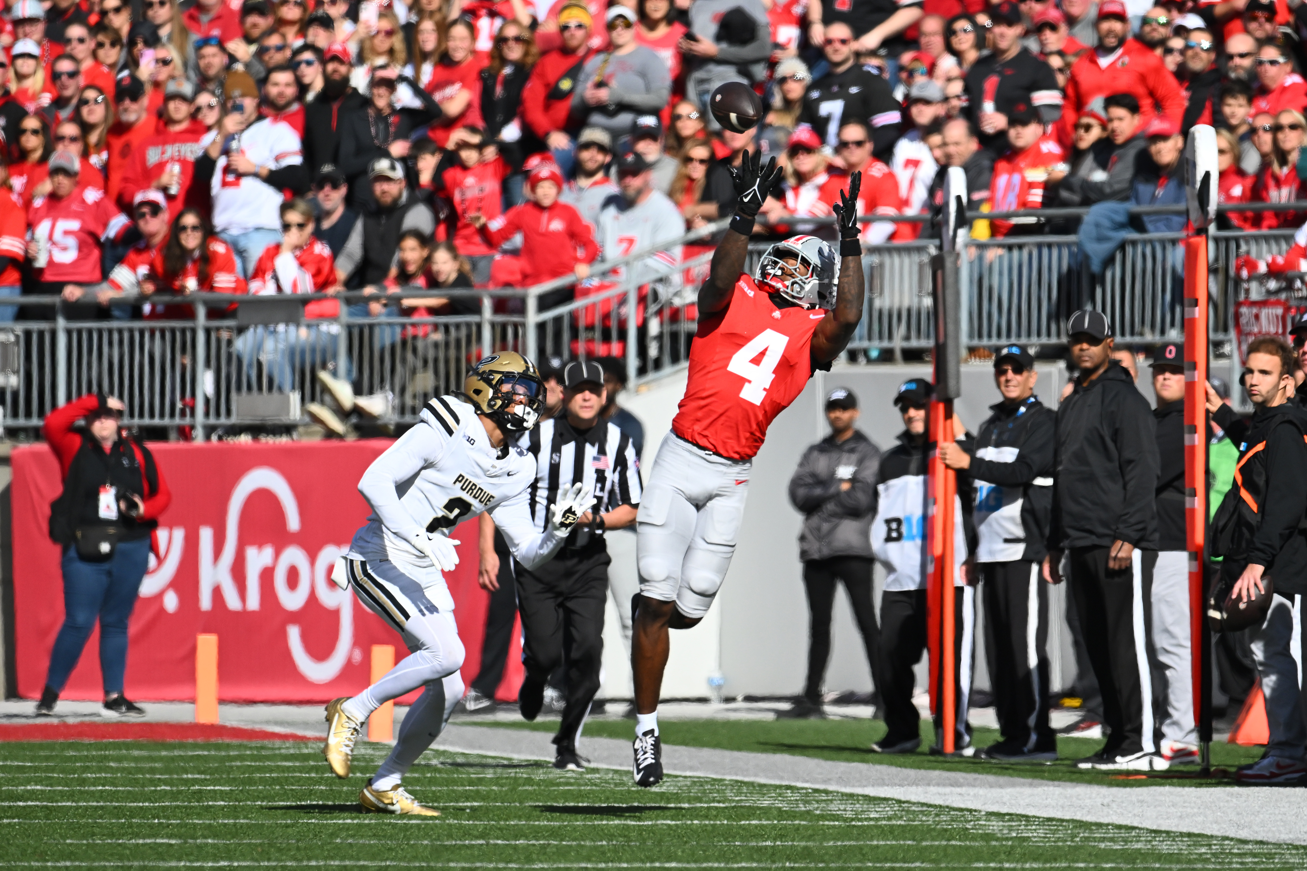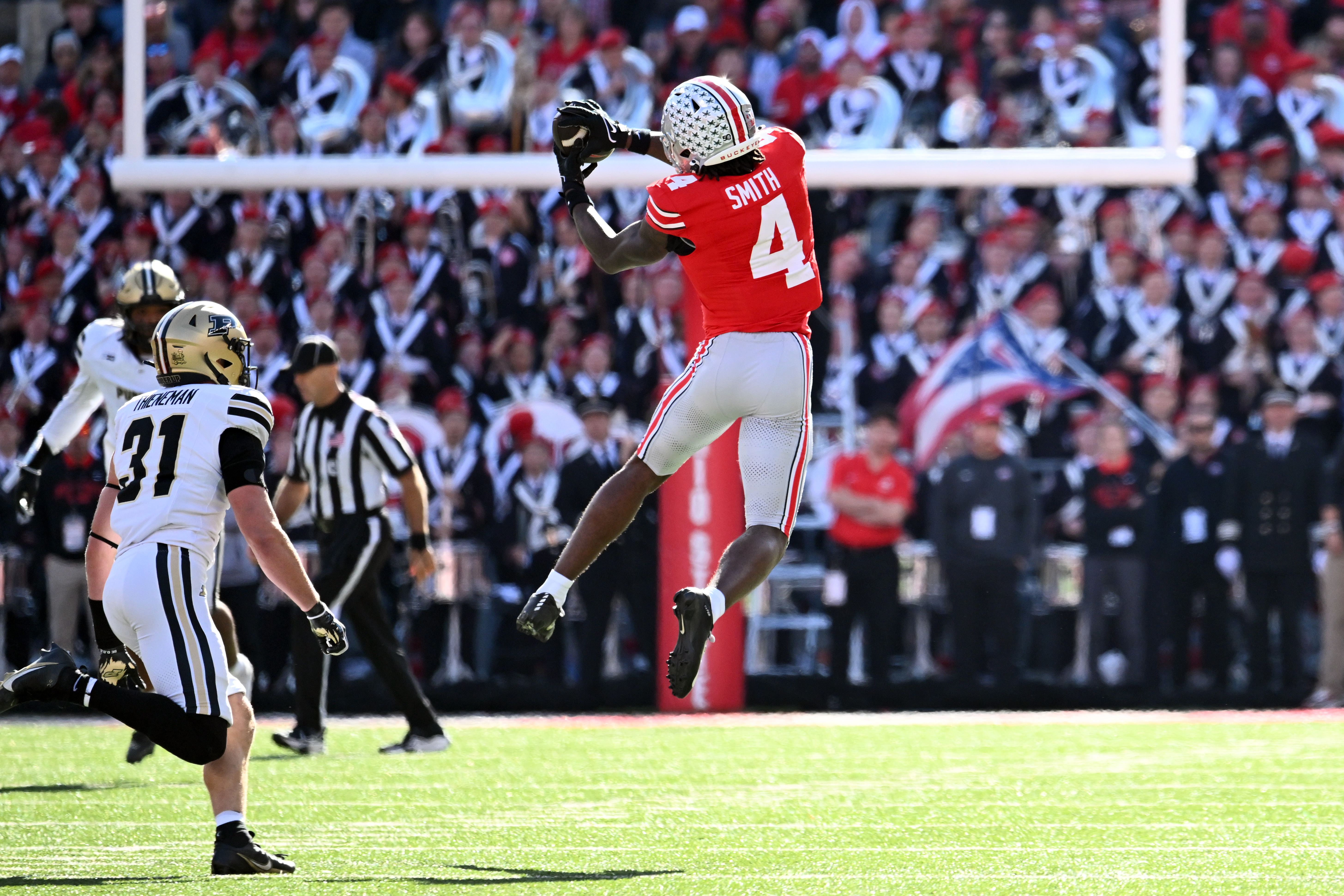 COLUMBUS, OH – NOVEMBER 09: Ohio State Buckeyes wide receiver Jeremiah Smith (4) catches a pass during the game against the Purdue Boilermakers and the Ohio State Buckeyes on November 9, 2024, at Ohio Stadium in Columbus, OH. (Photo by Ian Johnson/Icon Sportswire via Getty Images)