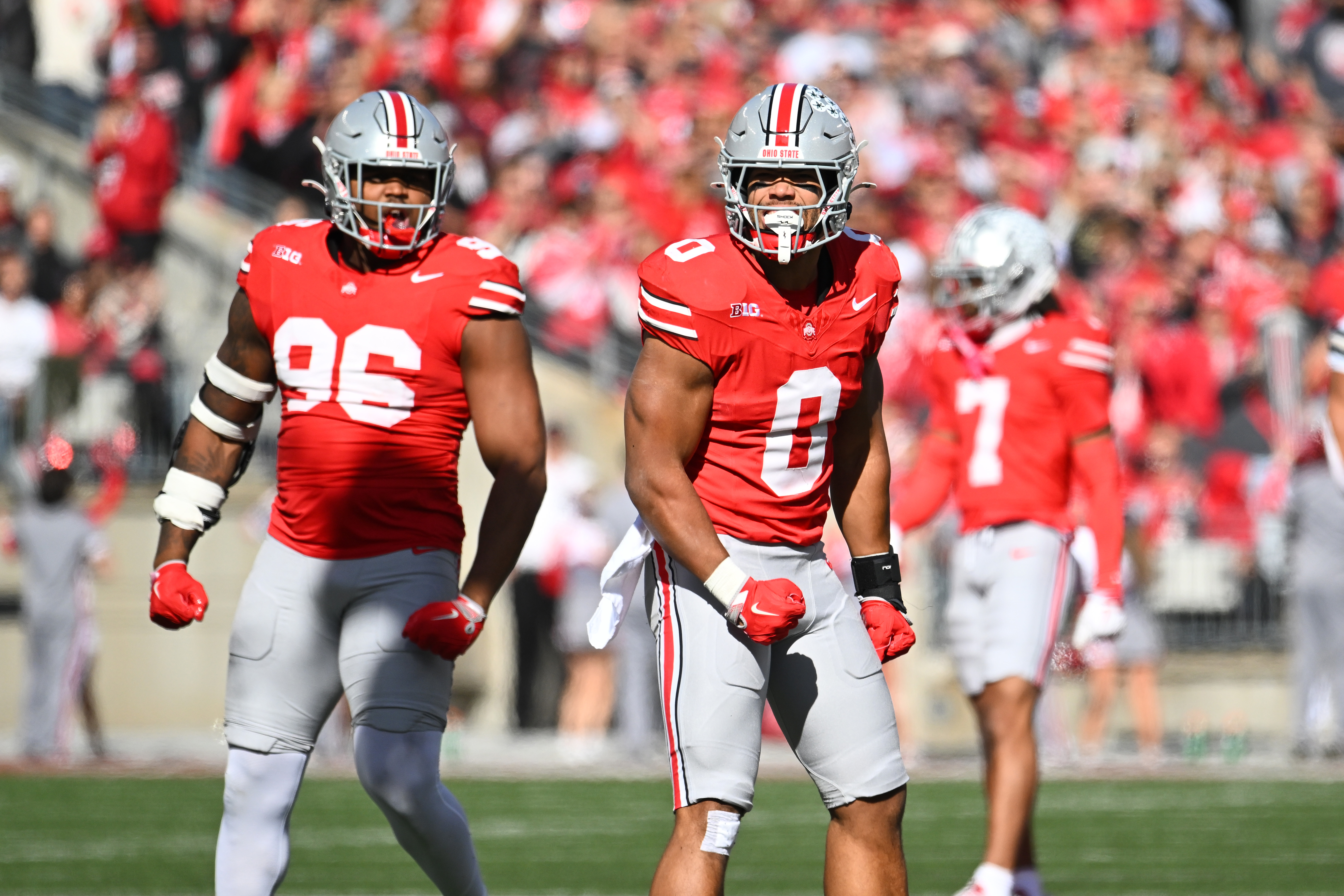 COLUMBUS, OHIO – NOVEMBER 09: Cody Simon #0 of the Ohio State Buckeyes reacts after sacking the quarterback during the first quarter of a game against the Purdue Boilermakers at Ohio Stadium on November 09, 2024 in Columbus, Ohio. (Photo by Ben Jackson/Getty Images)
