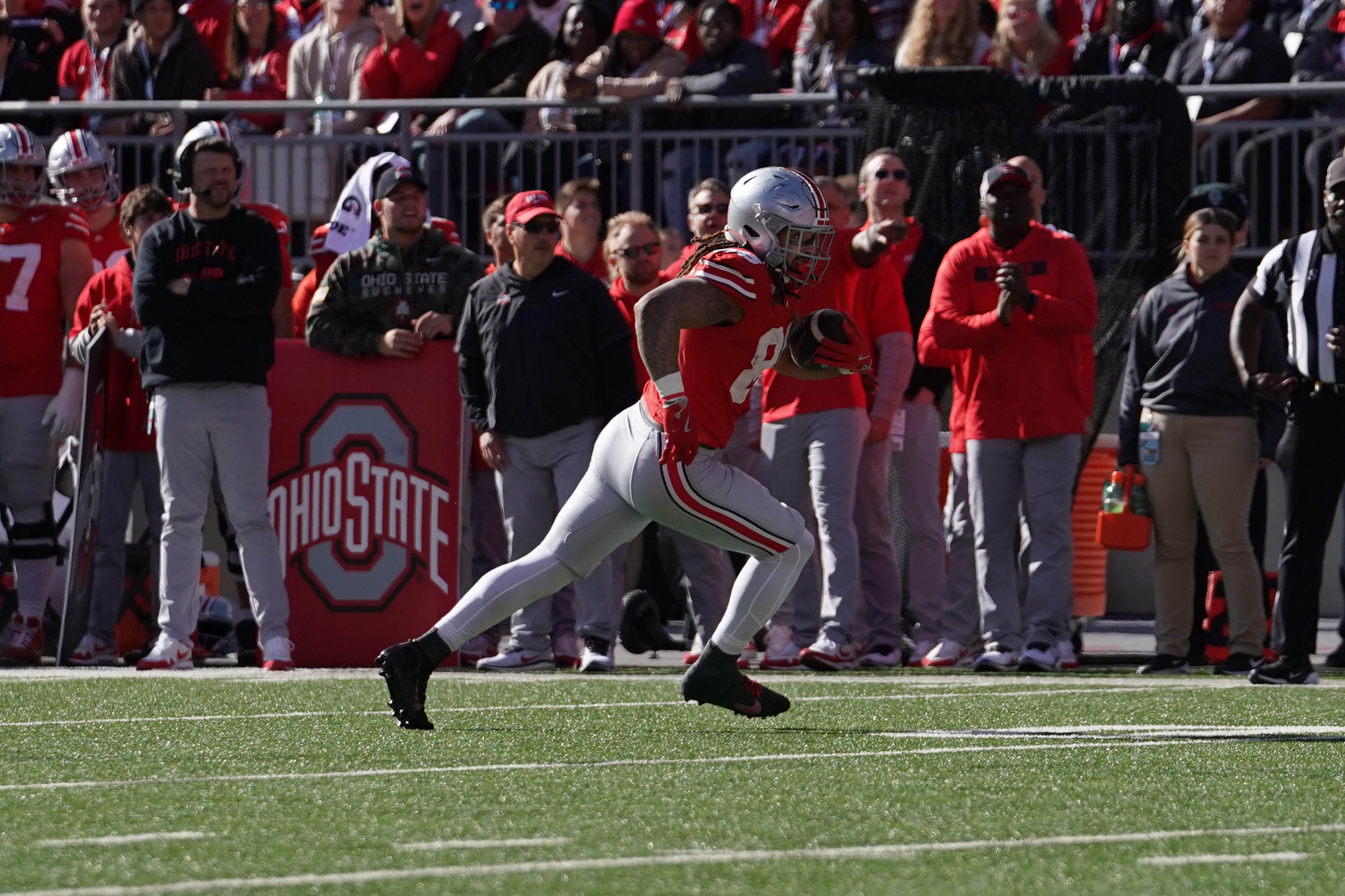 TreVeyon Henderson scores the 19-yard touchdown, crossing the corner of the endzone, to put Ohio State up 31-0. Buckeyes complete a five-play, 76 yard drive that ate up 2:36 of the clock. There’s 3:07 left in the third quarter.