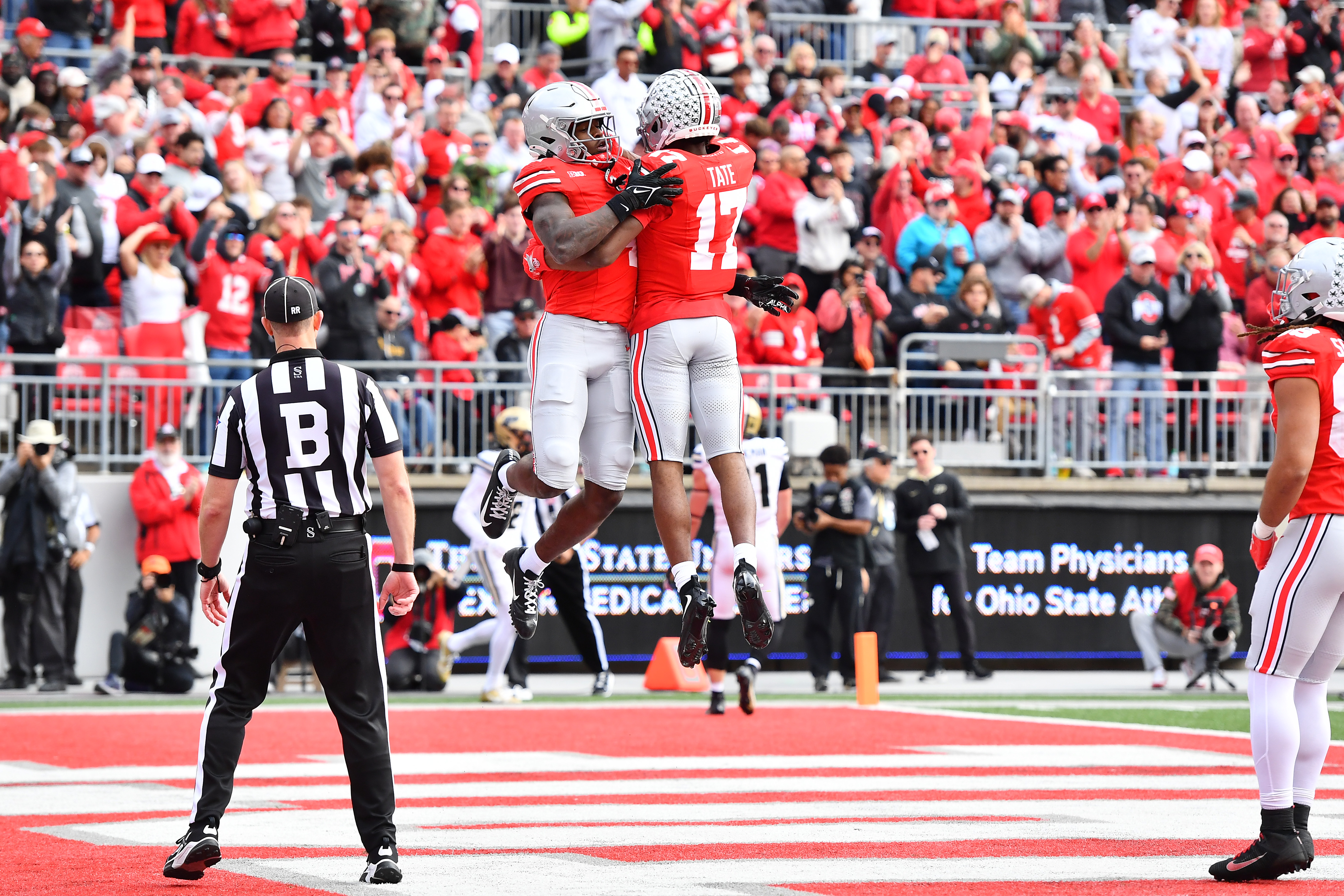 COLUMBUS, OHIO – NOVEMBER 09: Jeremiah Smith #4 of the Ohio State Buckeyes celebrates his second quarter touchdown with teammate Carnell Tate #17 of the Ohio State Buckeyes during a game against the Purdue Boilermakers at Ohio Stadium on November 09, 2024 in Columbus, Ohio. (Photo by Ben Jackson/Getty Images)