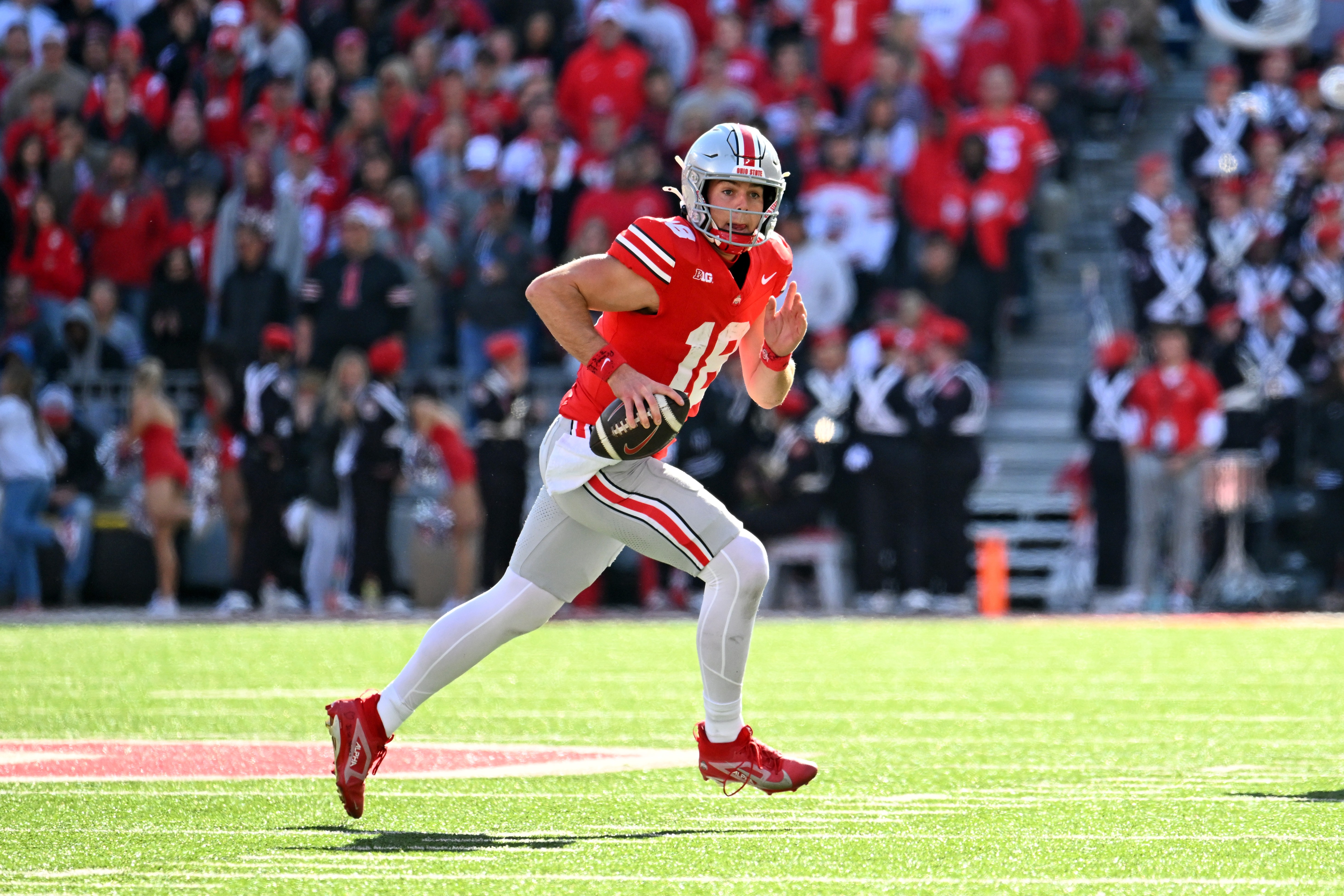 COLUMBUS, OHIO – NOVEMBER 09: Quarterback Will Howard #18 of the Ohio State Buckeyes runs with the ball during the second quarter of a game against the Purdue Boilermakers at Ohio Stadium on November 09, 2024 in Columbus, Ohio. (Photo by Ben Jackson/Getty Images)