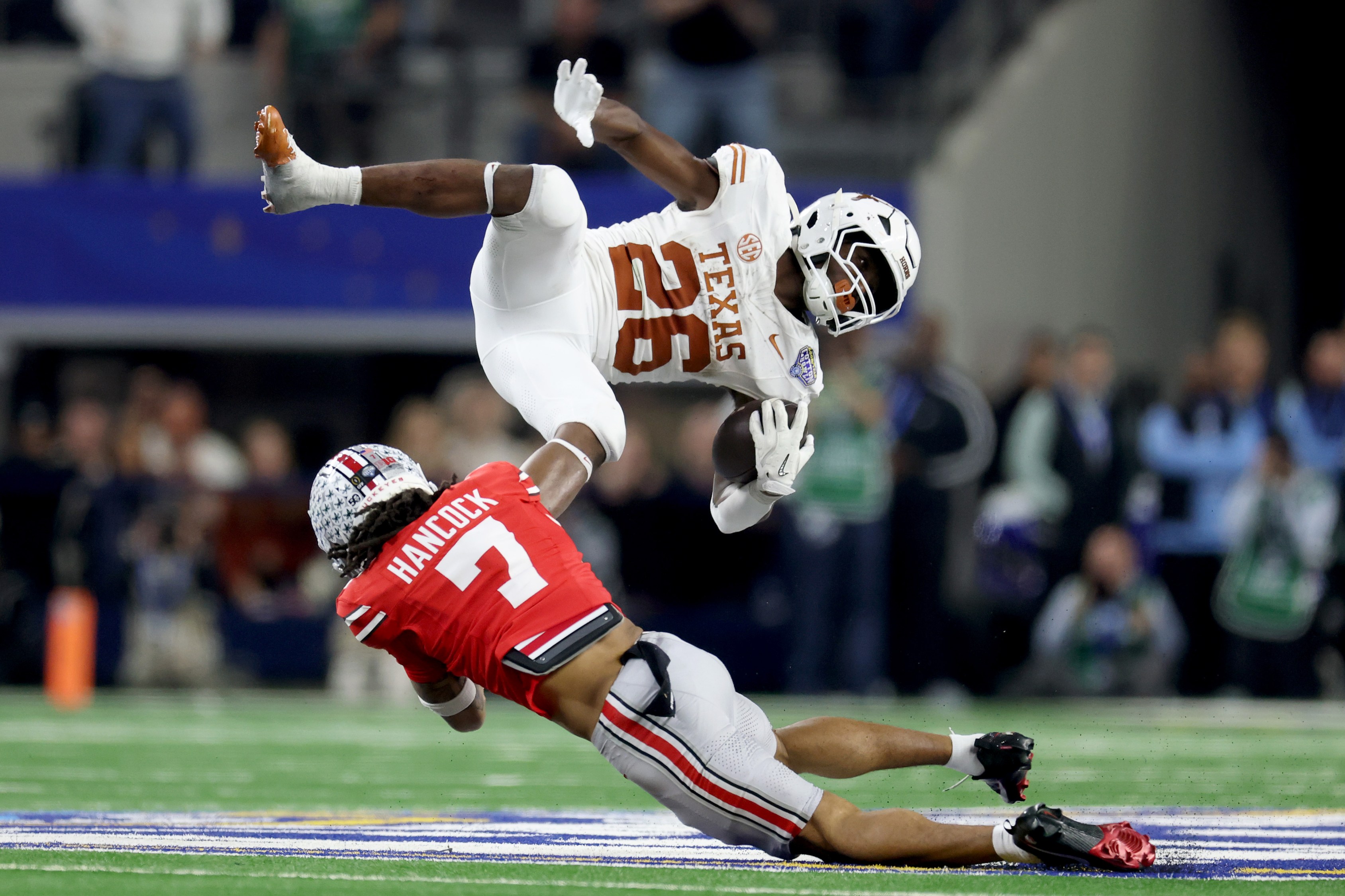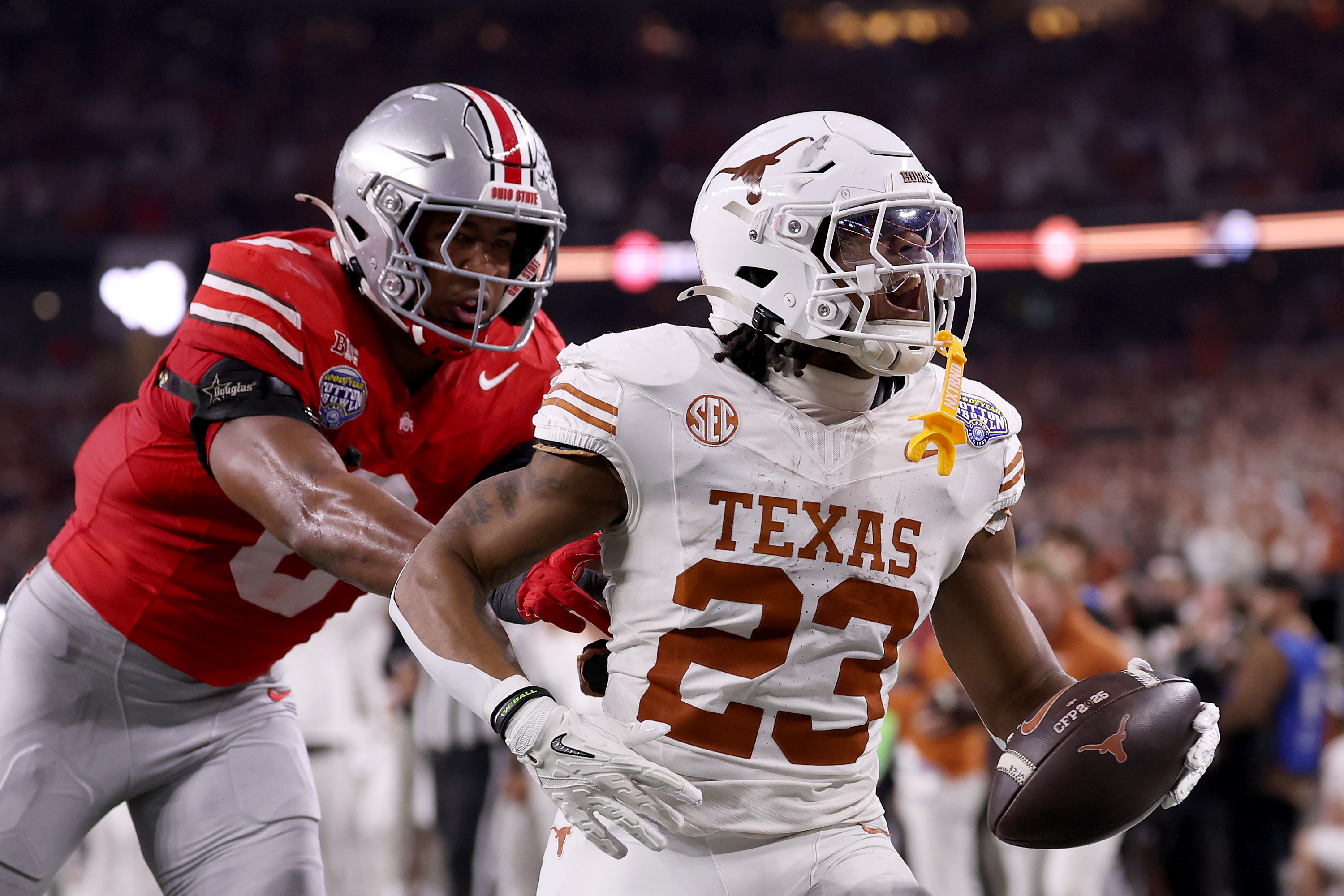 In the semifinal, the game turned on a fourth-down Texas play when Ohio State’s Jack Sawyer returned a Quinn Ewers fumble 83 yards for a touchdown. After the Longhorns got the ball back, Caleb Downs intercepted Ewers, leaving a 1:44 on the clock.