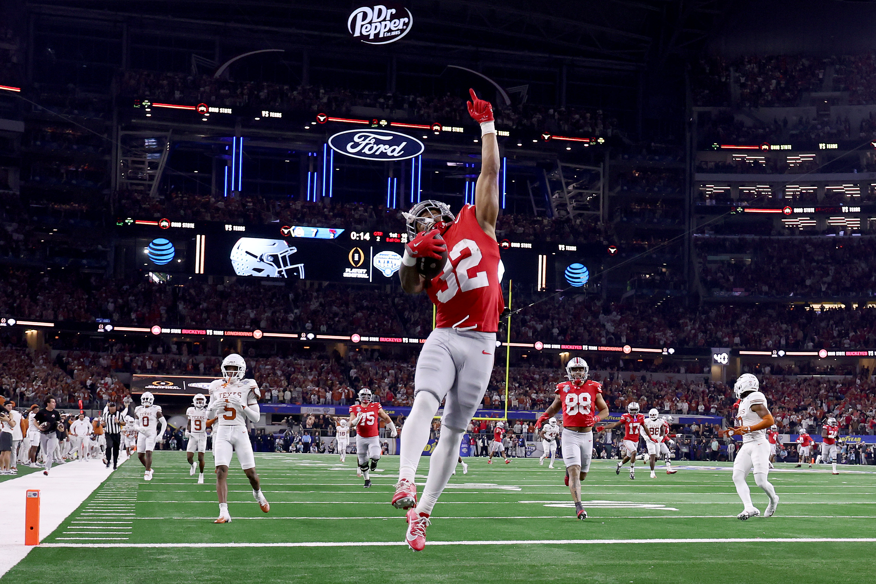 The Buckeyes took an early lead on their opening drive with a 9-yard touchdown run by Quinshon Judkins. The Longhorns were able to tie the score late in the second quarter with a 18-yard touchdown pass from Ewers to Jaydon Blue. TreVeyon Henderson answered when he caught a pass from Will Howard and went 75 yards to the house, giving OSU momentum heading into the locker room.