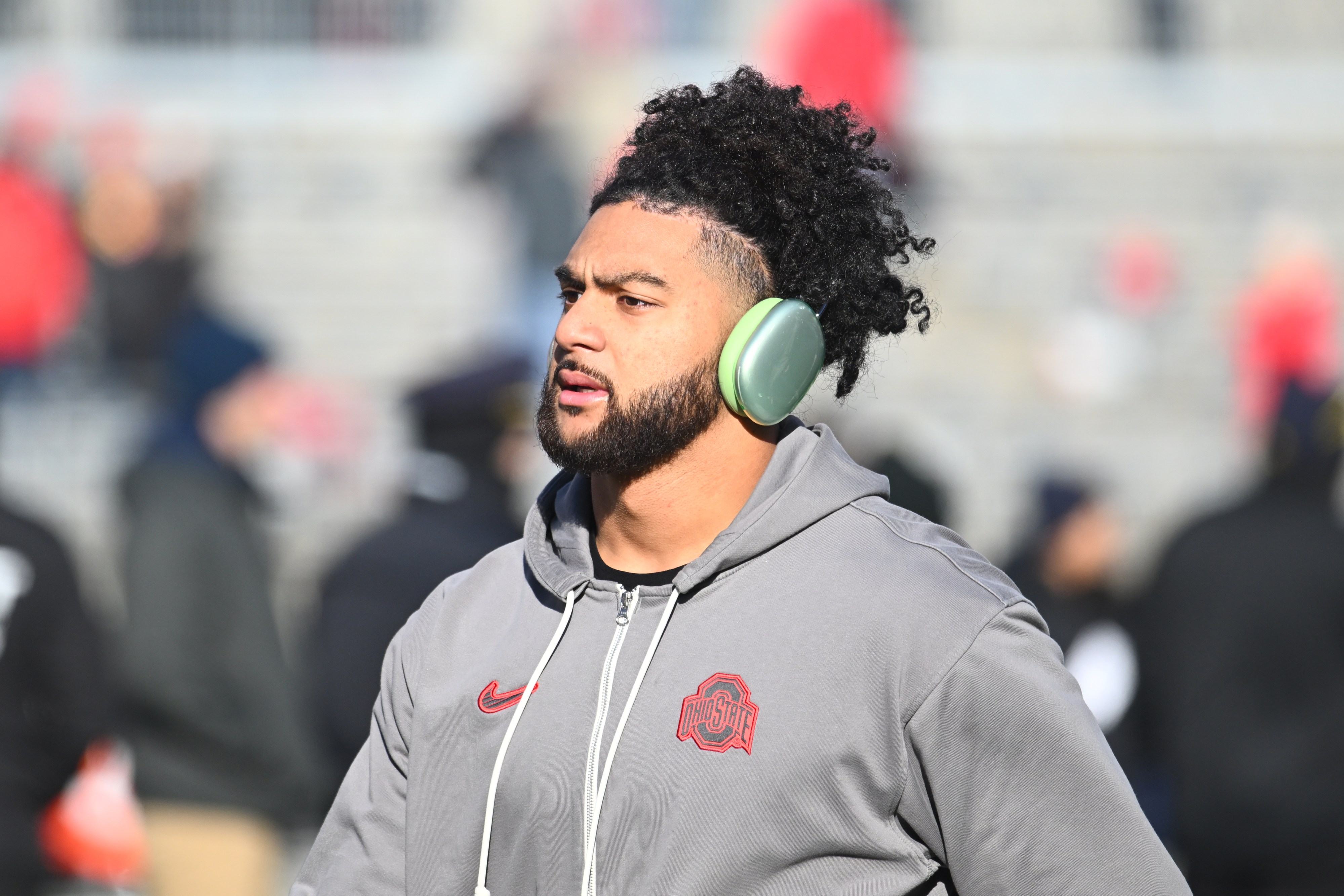 COLUMBUS, OHIO – NOVEMBER 30: JT Tuimoloau #44 of the Ohio State Buckeyes enters Ohio Stadium prior to a game against the Michigan Wolverines on November 30, 2024 in Columbus, Ohio. (Photo by Ben Jackson/Getty Images)