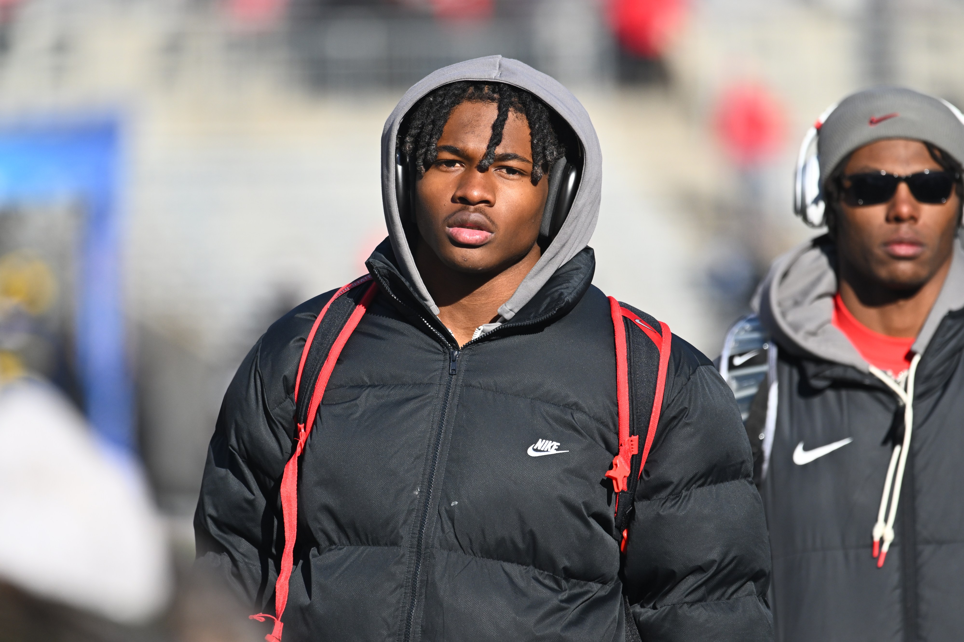 COLUMBUS, OHIO – NOVEMBER 30: Jeremiah Smith #4 of the Ohio State Buckeyes enters Ohio Stadium prior to a game against the Michigan Wolverines on November 30, 2024 in Columbus, Ohio. (Photo by Ben Jackson/Getty Images)