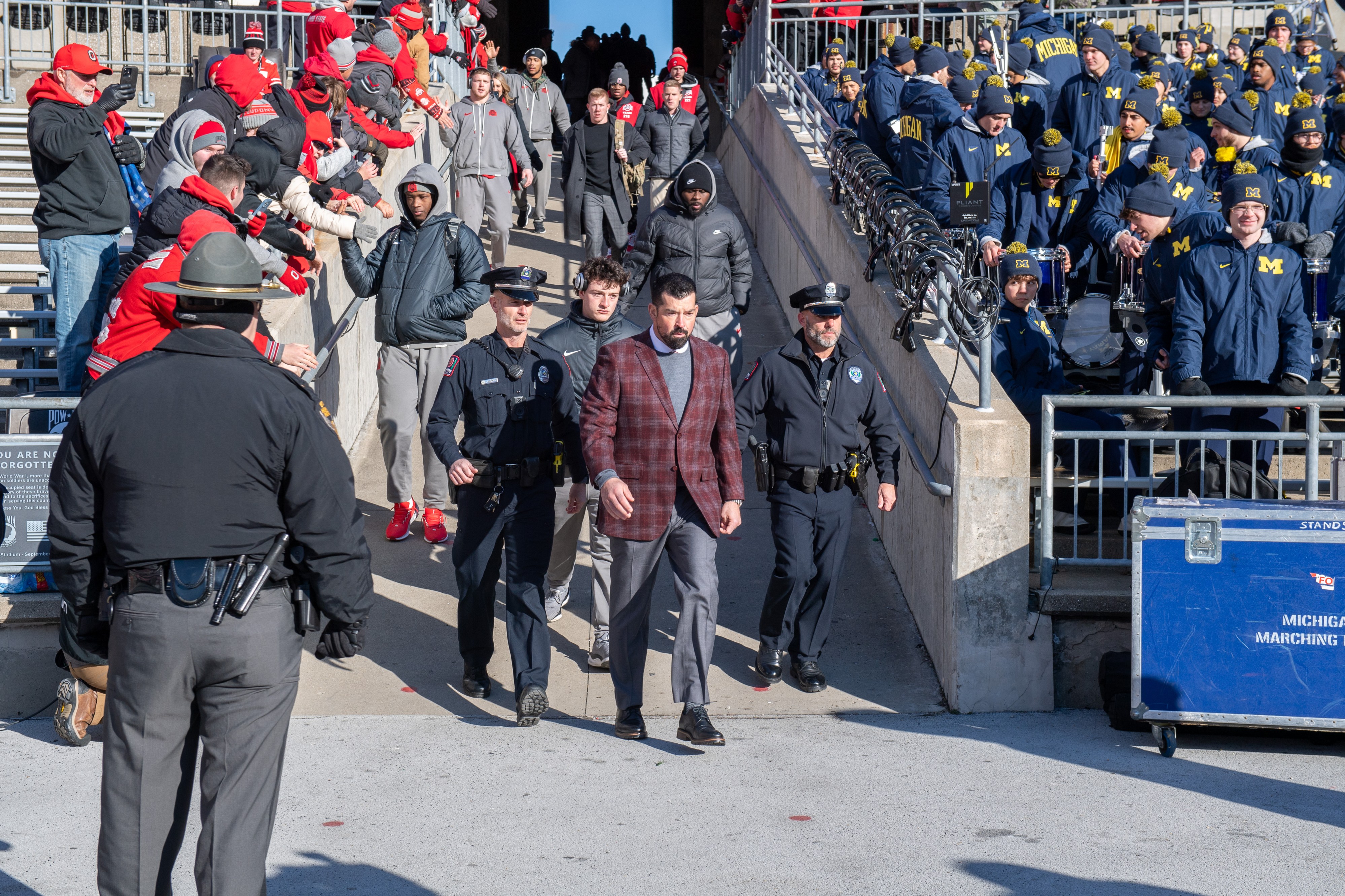 COLUMBUS, OH – NOVEMBER 30: Michigan Wolverines head coach Sherrone Moore walks off the field after the game against the Michigan Wolverines and the Ohio State Buckeyes on November 30, 2024, at Ohio Stadium in Columbus, OH. (Photo by Ian Johnson/Icon Sportswire via Getty Images)