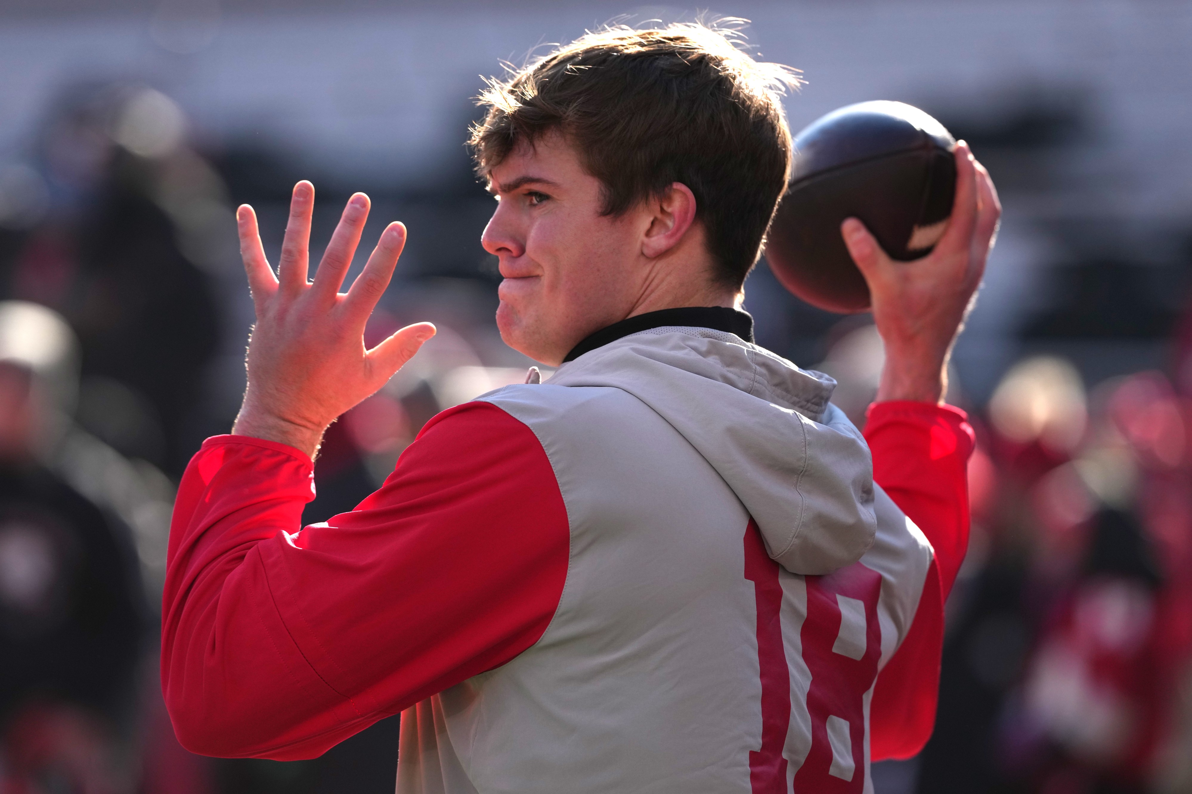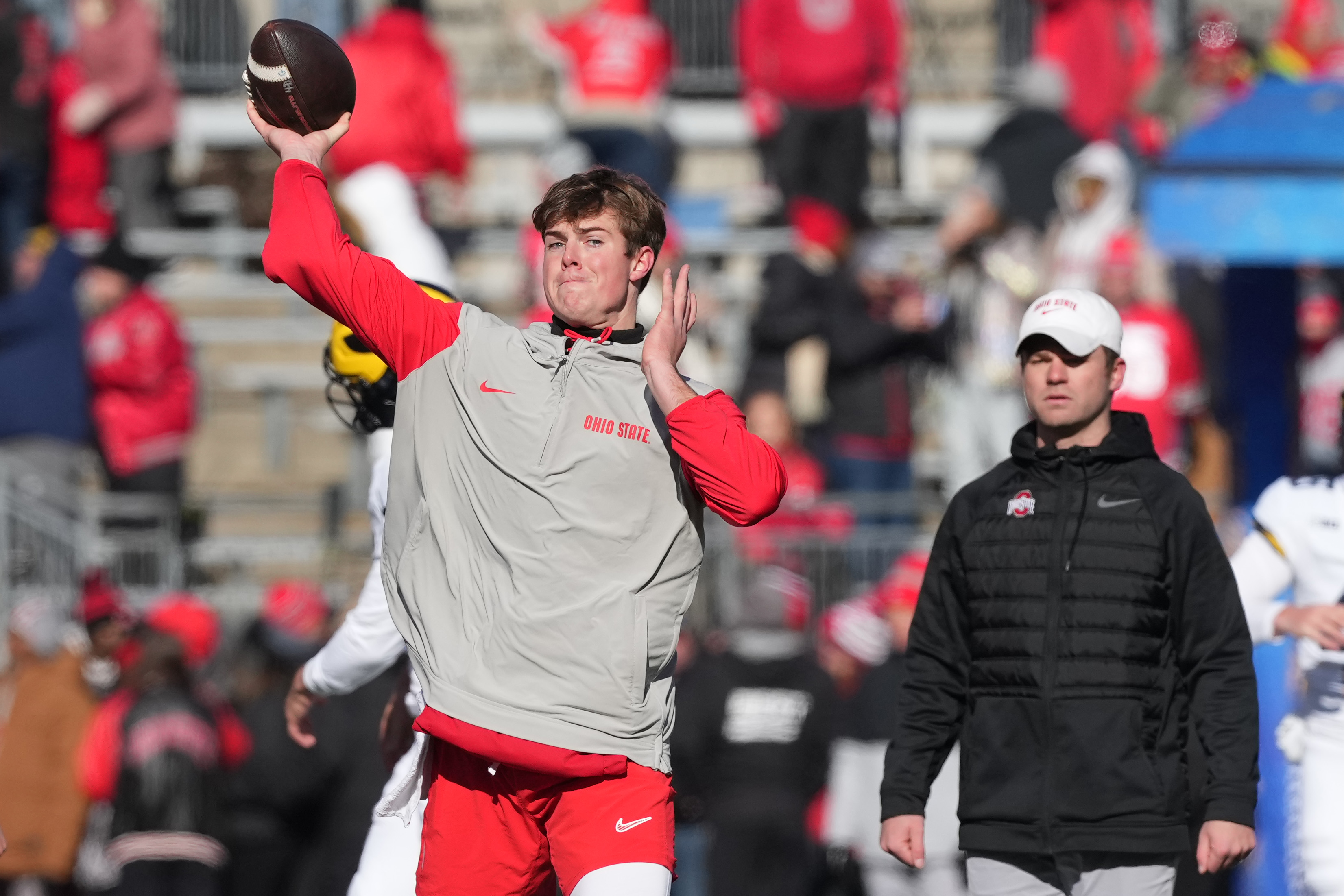 COLUMBUS, OHIO – NOVEMBER 30: Will Howard #18 of the Ohio State Buckeyes warms up before the game against the Michigan Wolverines at Ohio Stadium on November 30, 2024 in Columbus, Ohio. (Photo by Jason Mowry/Getty Images)