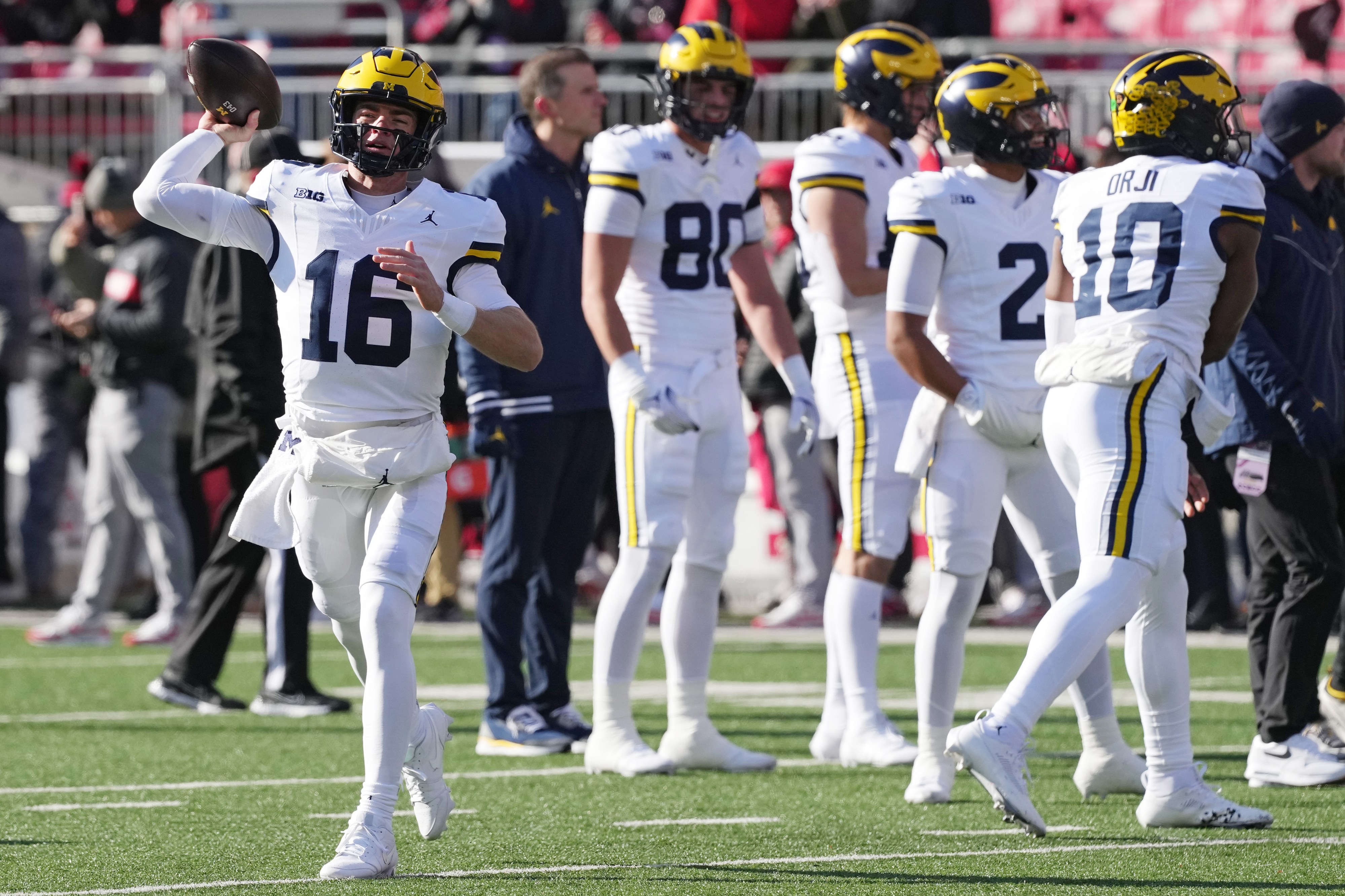 COLUMBUS, OHIO – NOVEMBER 30: Davis Warren #16 of the Michigan Wolverines warms up before the game against the Ohio State Buckeyes at Ohio Stadium on November 30, 2024 in Columbus, Ohio. (Photo by Jason Mowry/Getty Images)