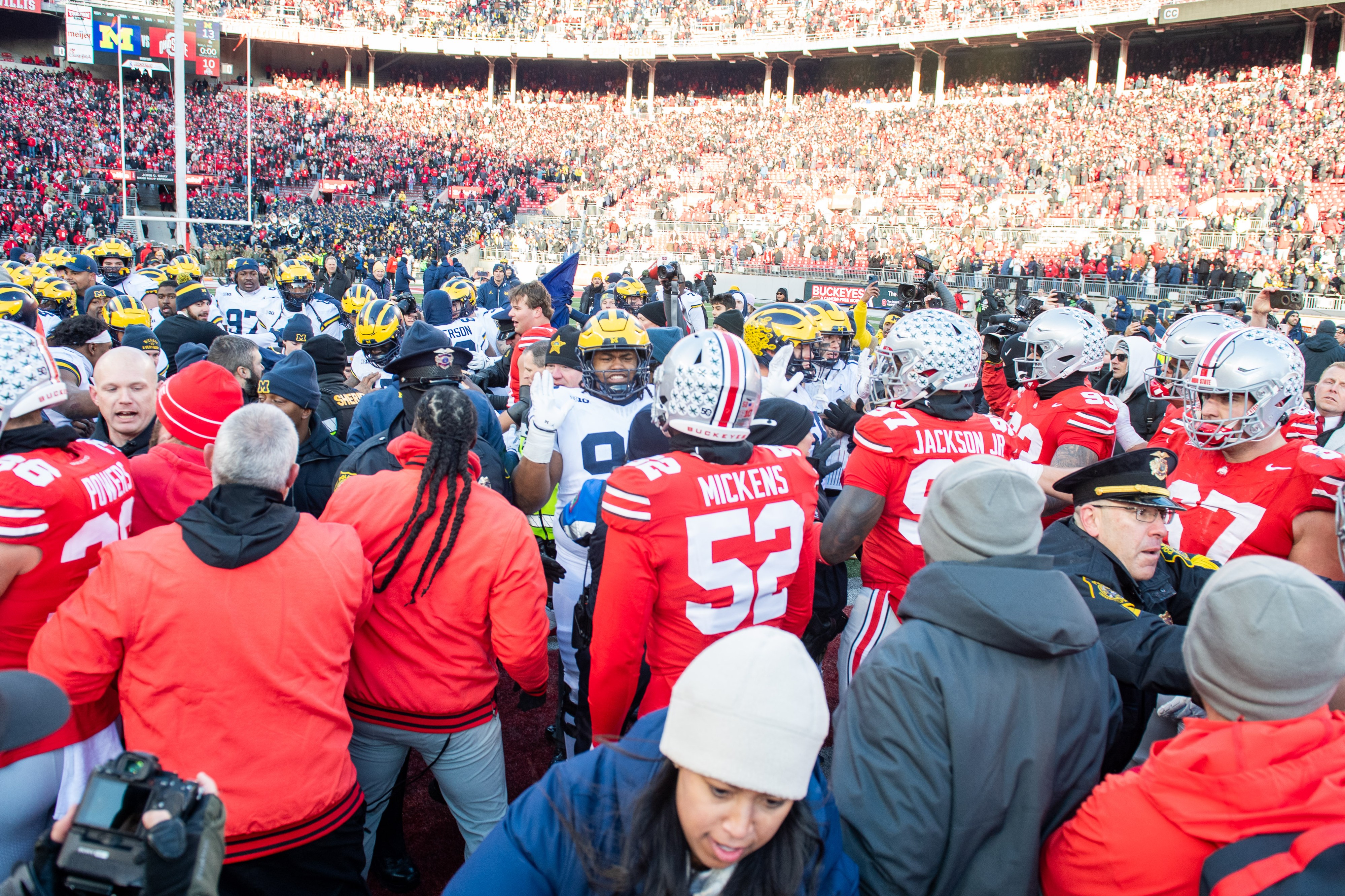 COLUMBUS, OHIO – NOVEMBER 30: A general shot of Ohio State players confronting Michigan Wolverines players after a college football game at Ohio Stadium on November 30, 2024 in Columbus, OH. The Michigan Wolverines won the game 13-10. (Photo by Aaron J. Thornton/Getty Images)
