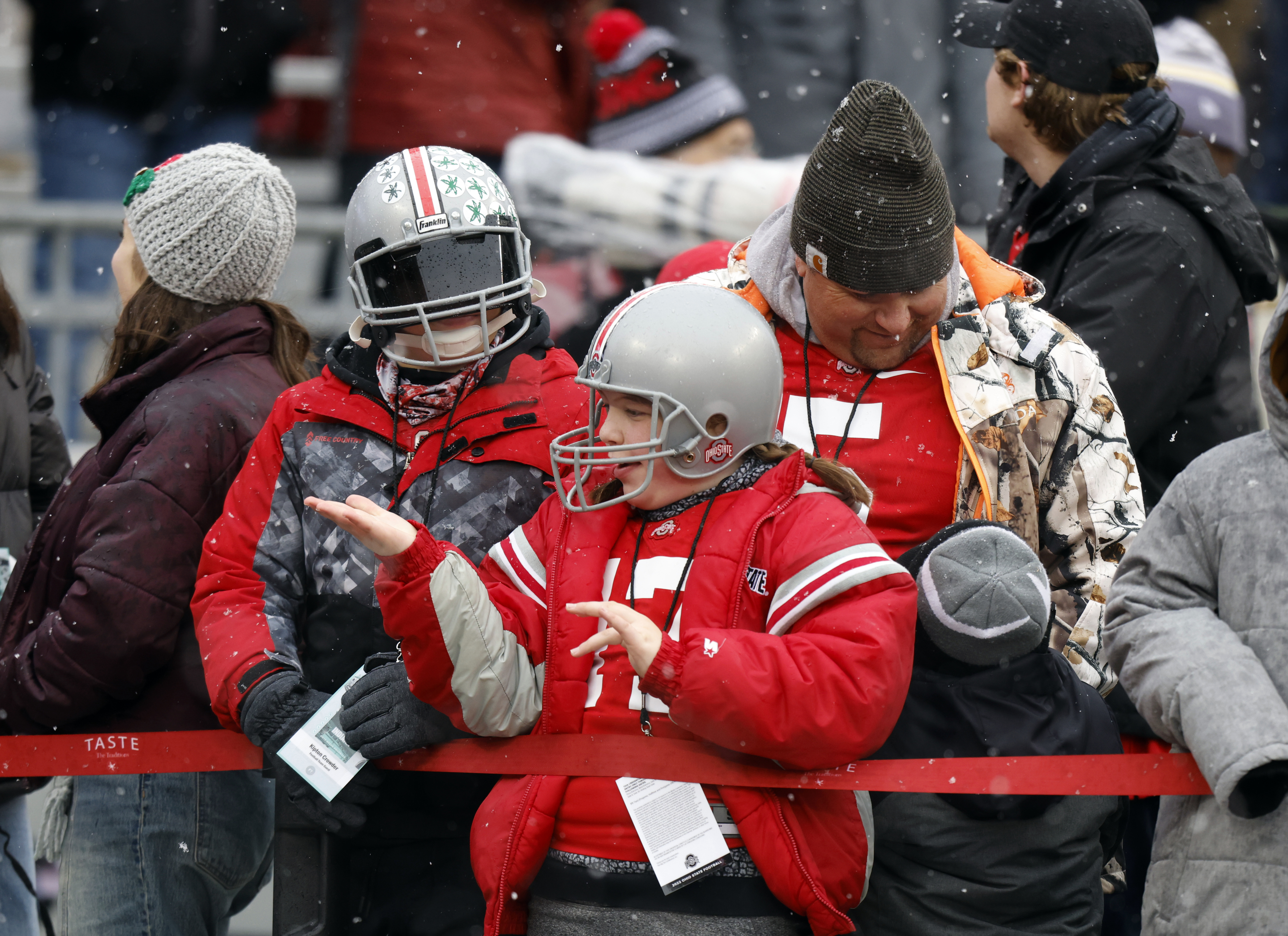 An Ohio State fan tries to catch a snowflake before an NCAA college football game against Indiana Saturday, Nov. 12, 2022 in Columbus, Ohio. (AP Photo/Paul Vernon)