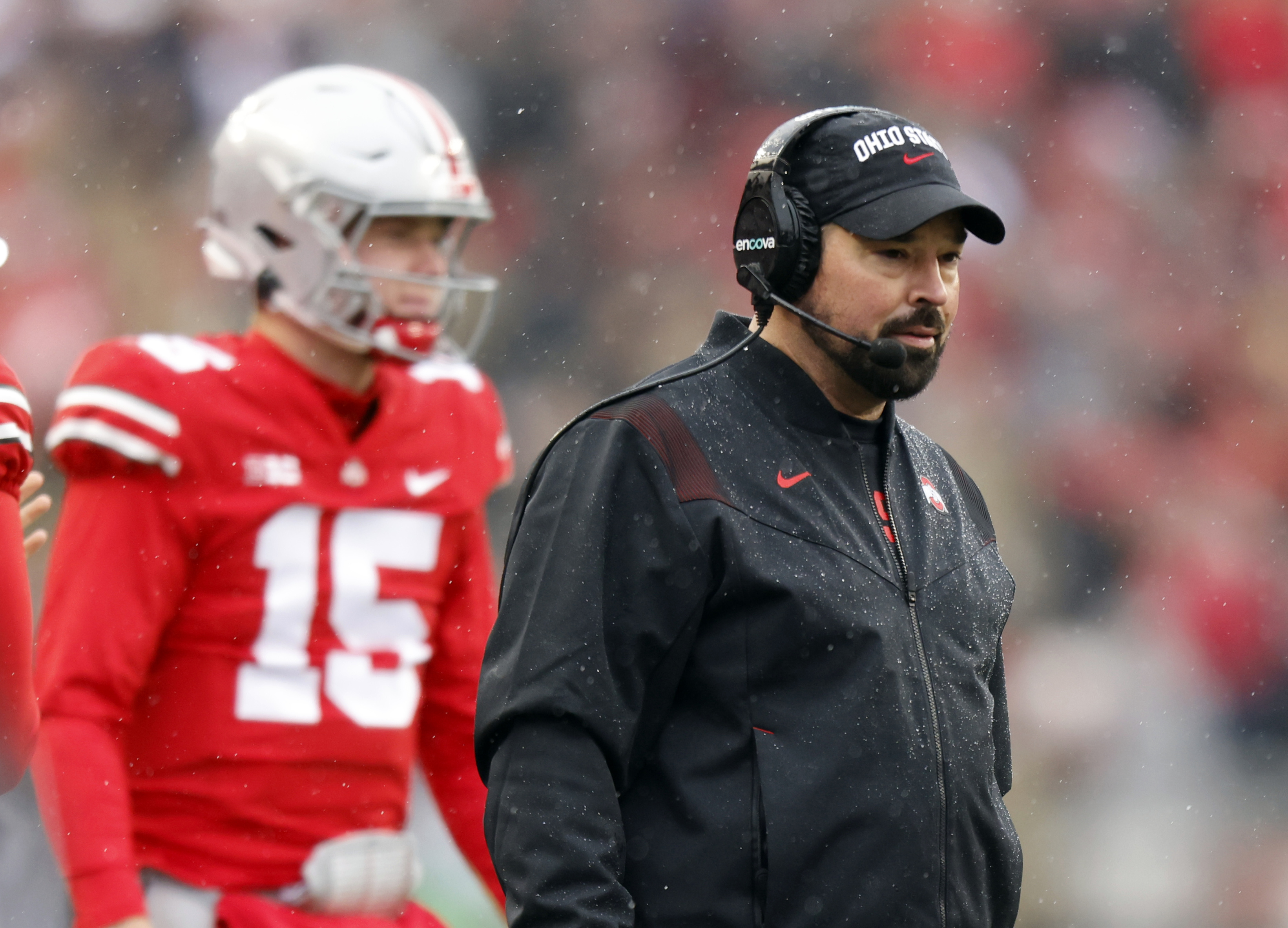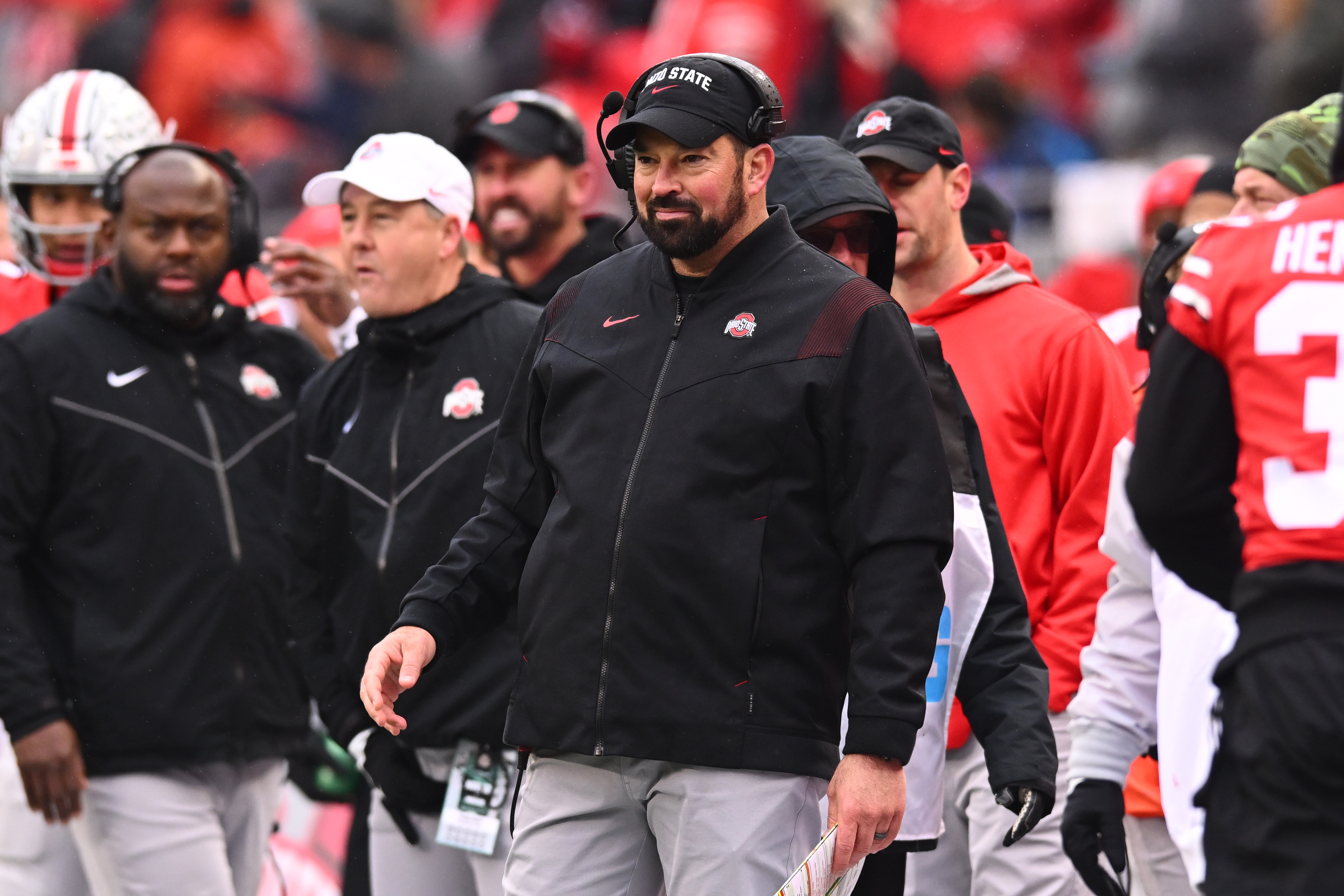 COLUMBUS, OHIO – NOVEMBER 12: Head Coach Ryan Day of the Ohio State Buckeyes reacts following an Ohio State touchdown during the fourth quarter of a game against the Indiana Hoosiers at Ohio Stadium on November 12, 2022 in Columbus, Ohio. (Photo by Ben Jackson/Getty Images)