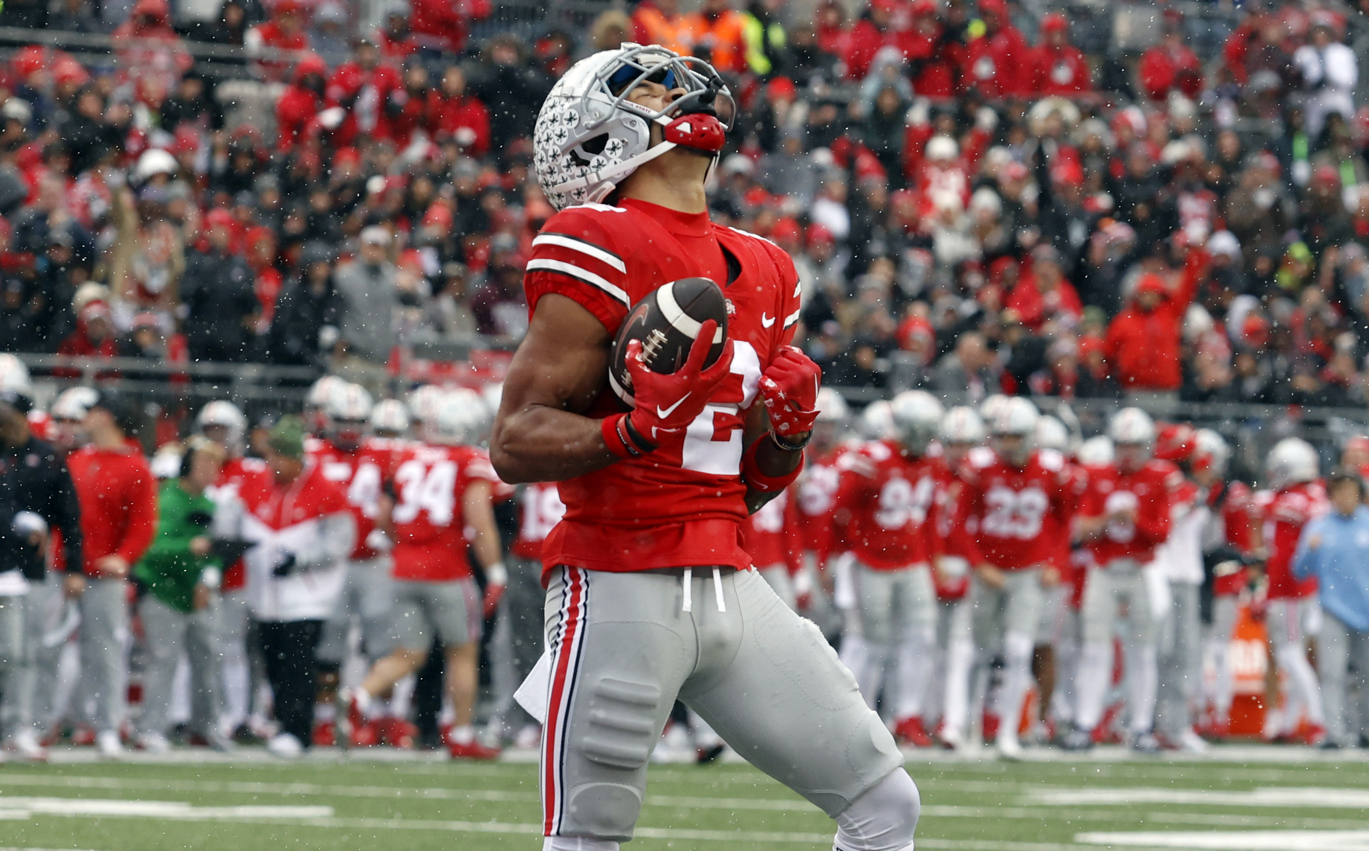 COLUMBUS, OHIO – NOVEMBER 12: Emeka Egbuka #2 of the Ohio State Buckeyes reacts after scoring a touchdown during the first quarter of a game against the Indiana Hoosiers at Ohio Stadium on November 12, 2022 in Columbus, Ohio. (Photo by Ben Jackson/Getty Images)