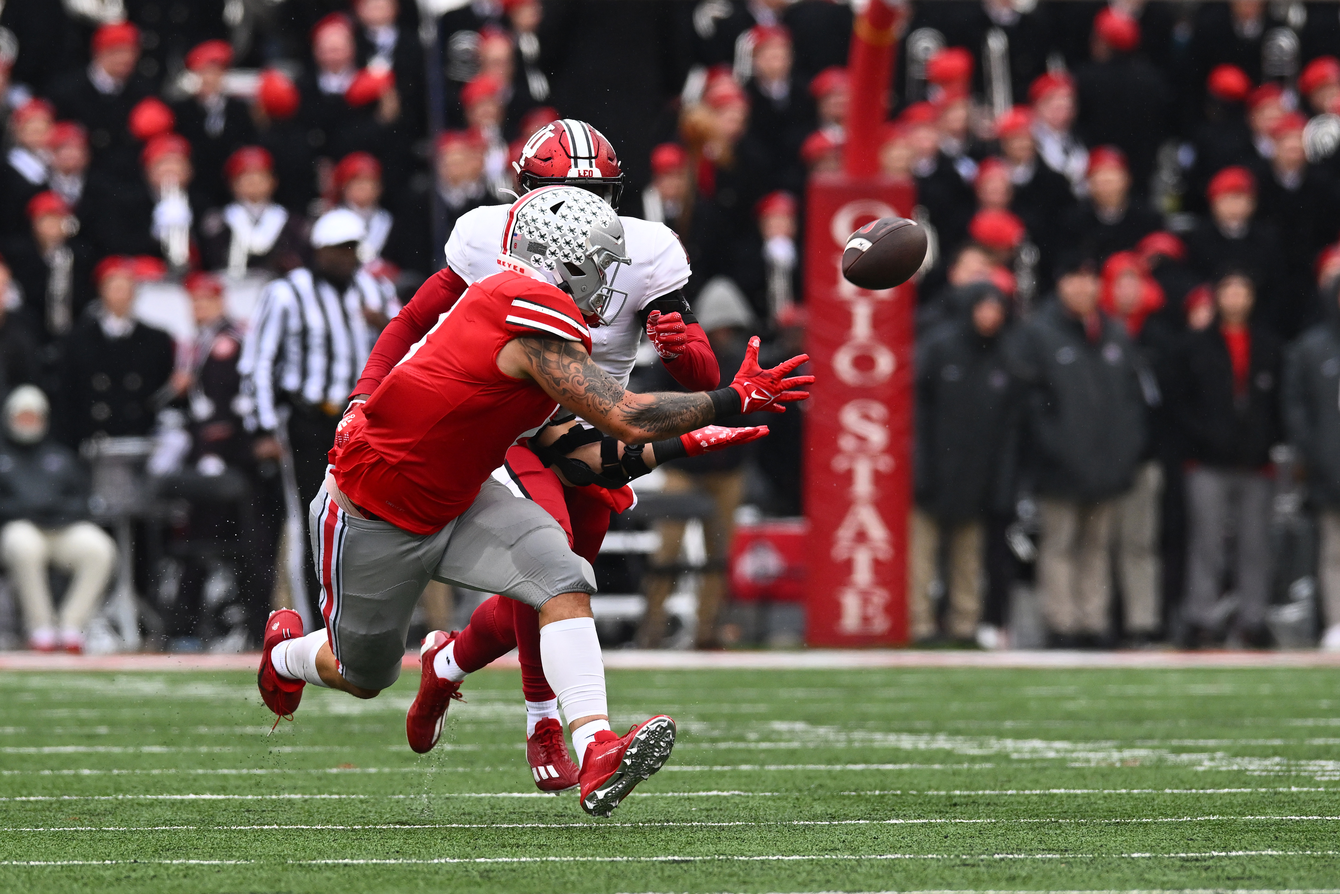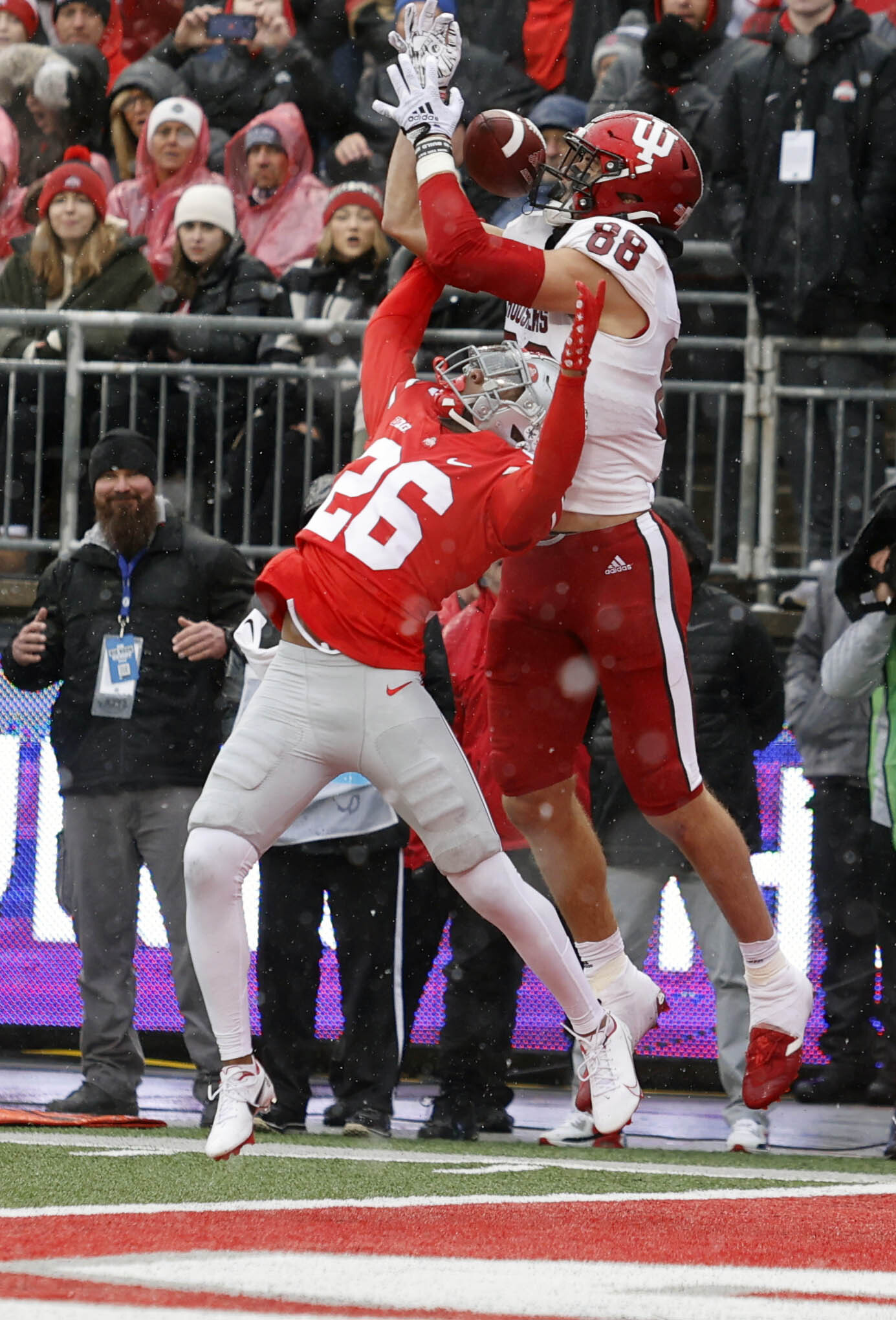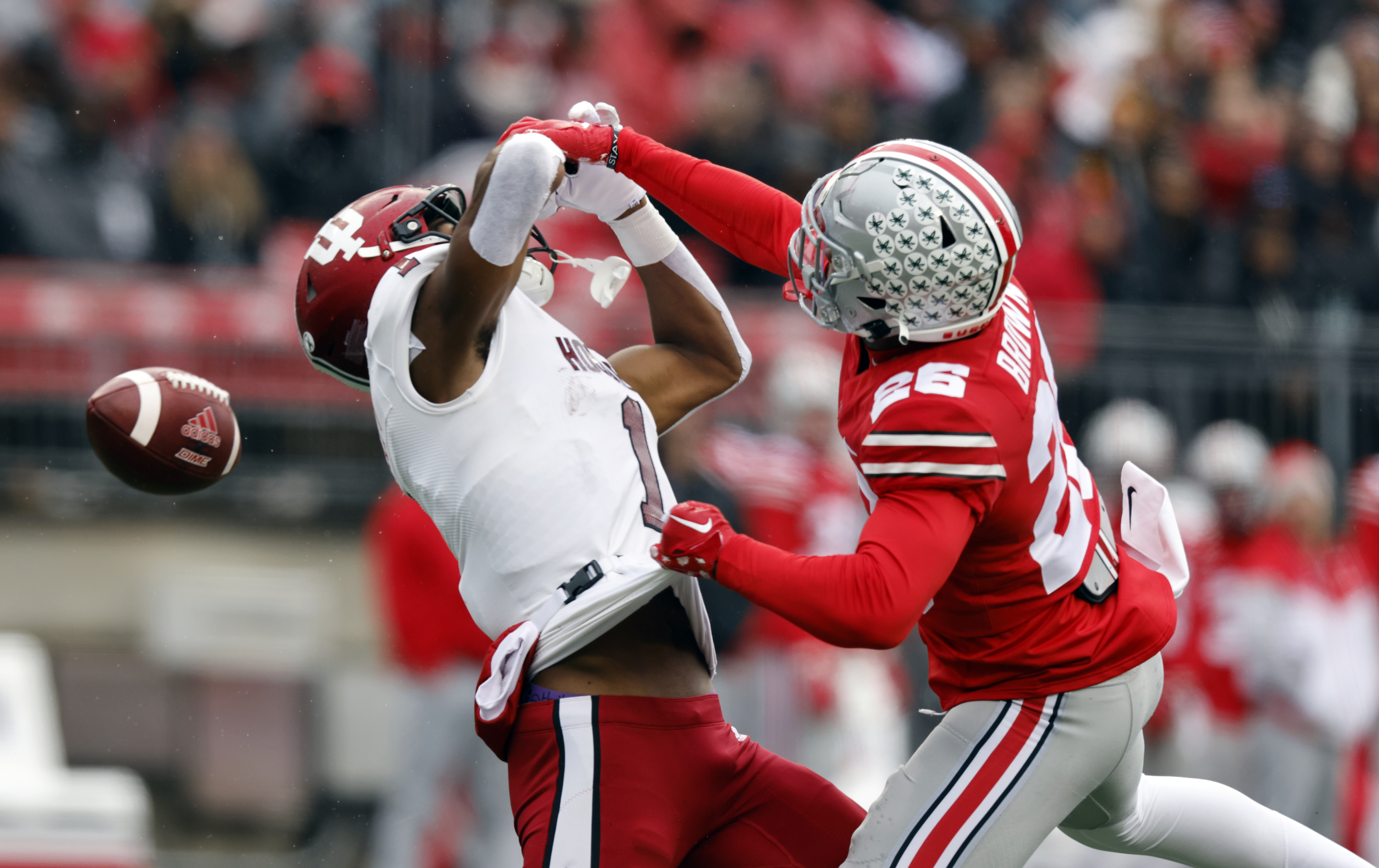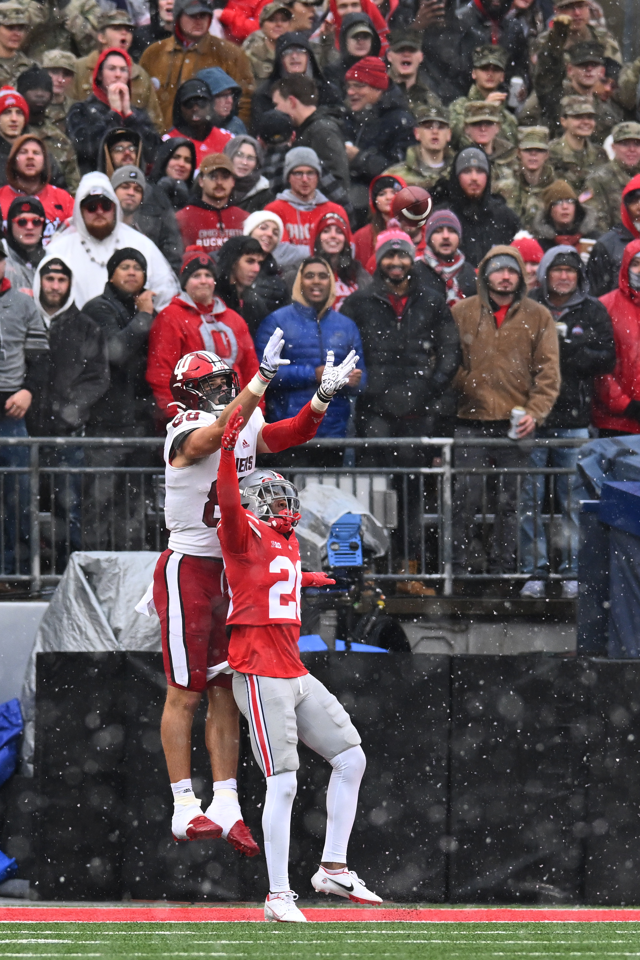 COLUMBUS, OHIO – NOVEMBER 12: AJ Barner #88 of the Indiana Hoosiers reaches for a pass above Cameron Brown #26 of the Ohio State Buckeyes during the first quarter of a game at Ohio Stadium on November 12, 2022 in Columbus, Ohio. (Photo by Ben Jackson/Getty Images)