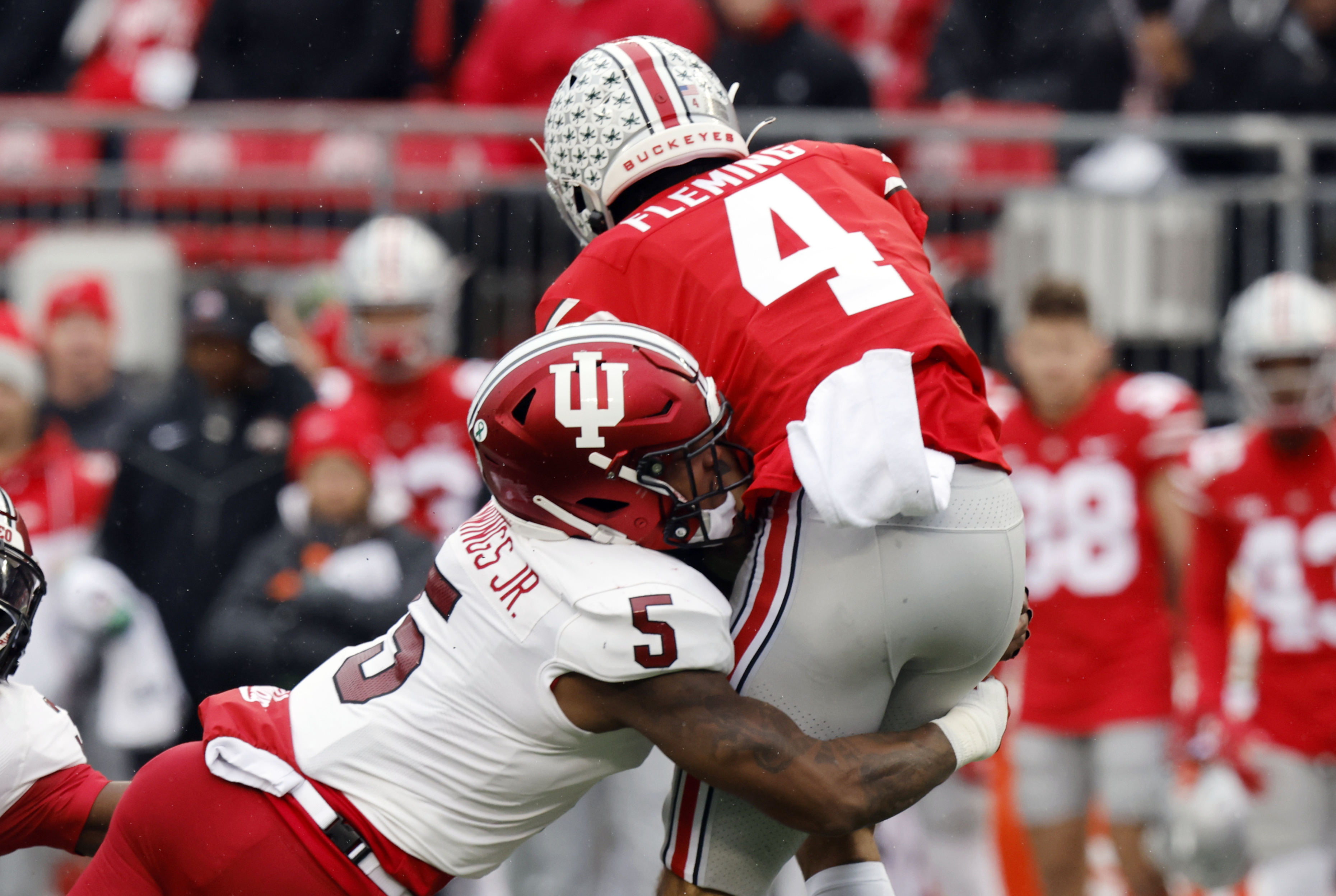 Indiana marched down the field, taking it from its own 18 down to the Buckeyes’ 29 before a Cover Zero blitz swarmed Williams for a loss of eight yards and a third-and-18 situation with 16 seconds left. Jack Sawyer was able to push his blocker backward and smacked Williams for a loss of five and the end of the half.