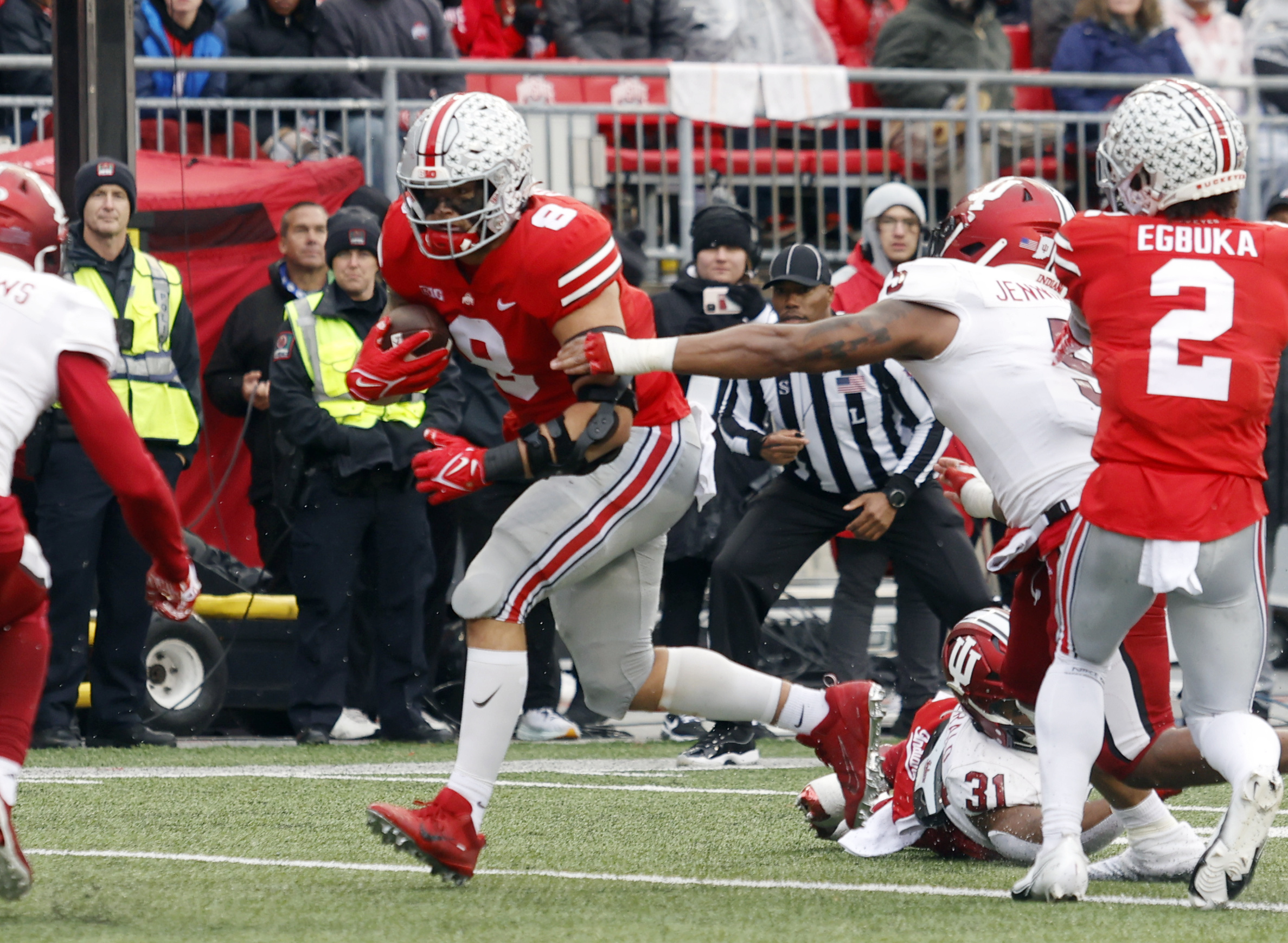 COLUMBUS, OHIO – NOVEMBER 12: Miyan Williams #3 of the Ohio State Buckeyes runs with the ball during the second quarter of a game against the Indiana Hoosiers at Ohio Stadium on November 12, 2022 in Columbus, Ohio. (Photo by Ben Jackson/Getty Images)