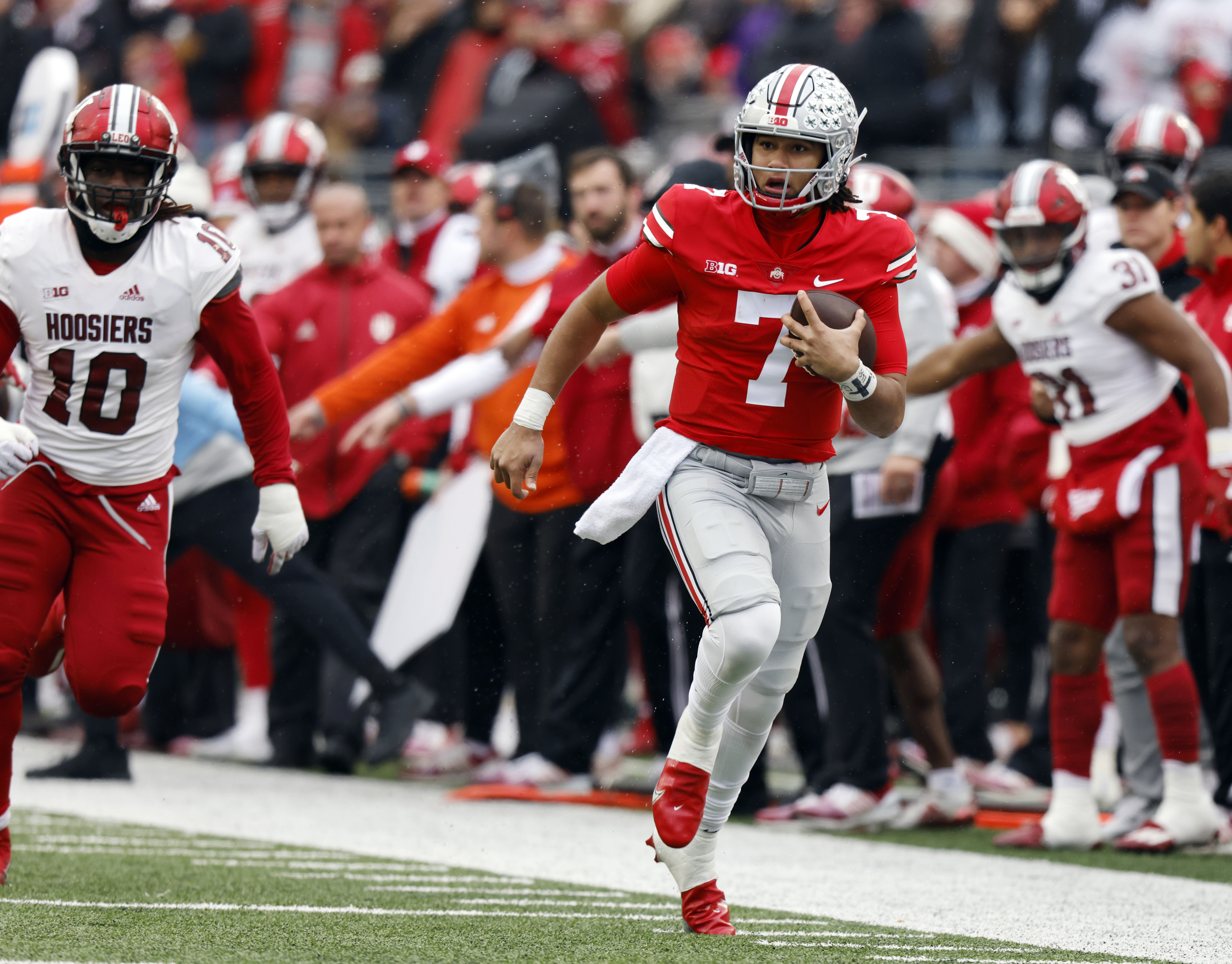 COLUMBUS, OHIO – NOVEMBER 12: C.J. Stroud #7 of the Ohio State Buckeyes reacts after being called for stepping out of bounds during the third quarter of a game against the Indiana Hoosiers at Ohio Stadium on November 12, 2022 in Columbus, Ohio. (Photo by Ben Jackson/Getty Images)