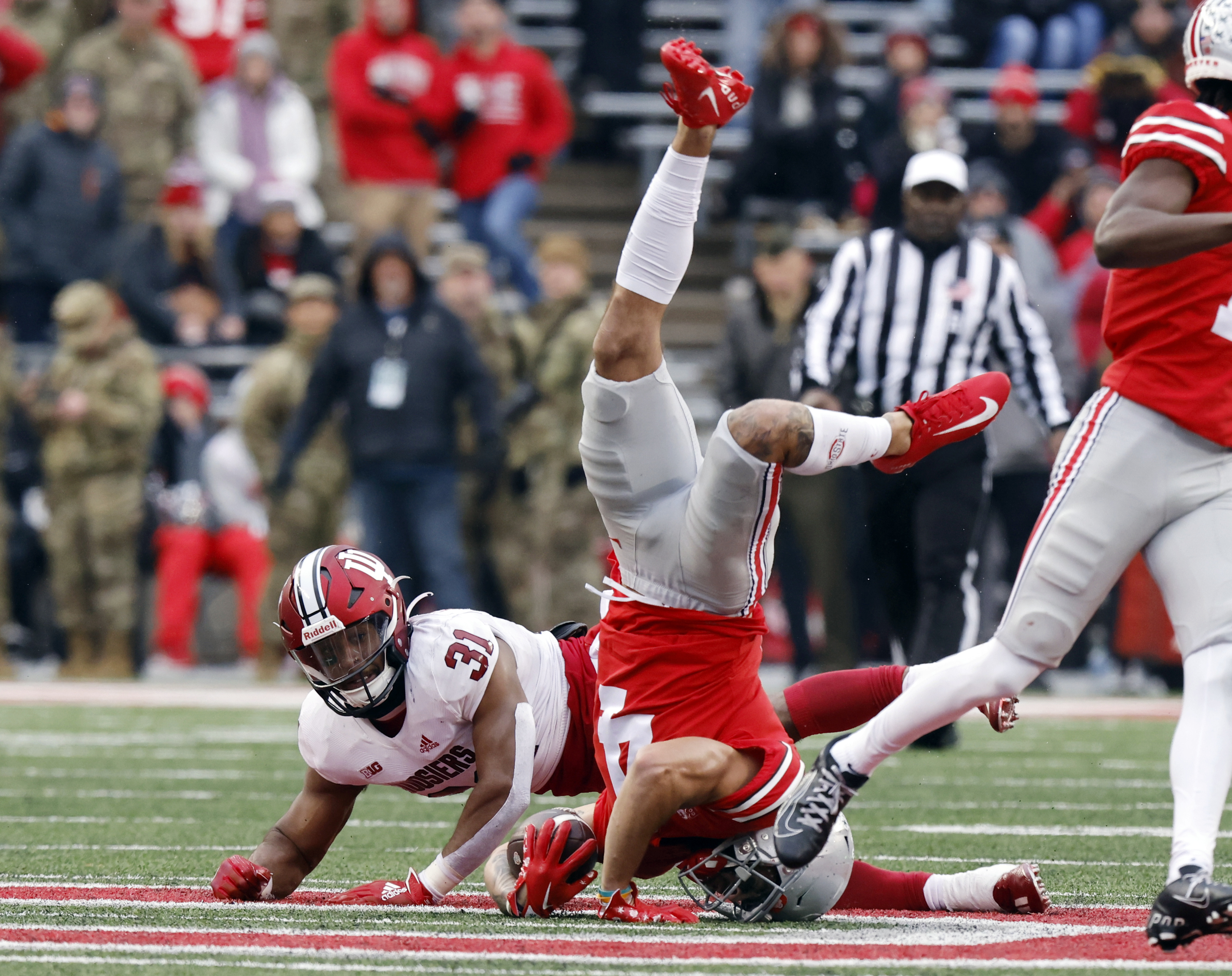 Ohio State wide receiver Julian Fleming, right, flips over Indiana defensive back Bryant Fitzgerald during the second half of an NCAA college football game Saturday, Nov. 12, 2022 in Columbus, Ohio. Ohio State won 56-14. (AP Photo/Paul Vernon)