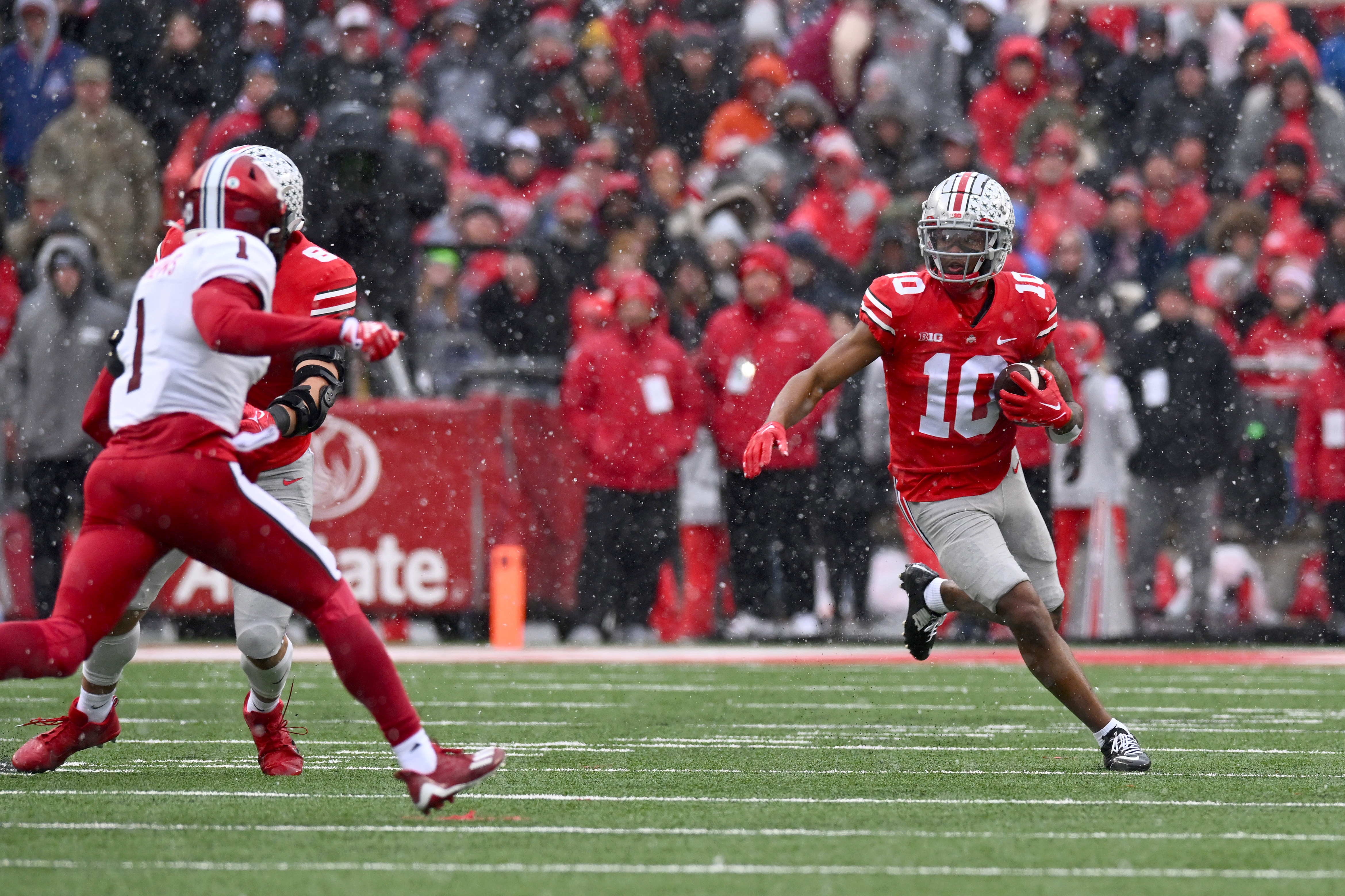 COLUMBUS, OHIO – NOVEMBER 12: Xavier Johnson #10 of the Ohio State Buckeyes runs with the ball during the first quarter of a game against the Indiana Hoosiers at Ohio Stadium on November 12, 2022 in Columbus, Ohio. (Photo by Ben Jackson/Getty Images)